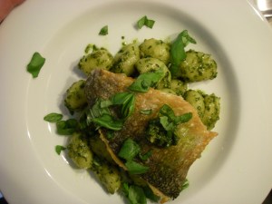 Die fertigen Gnocchi mit dem Pesto mischen, mit Basilikum bestreuen und mit der heißen Dorade servieren.