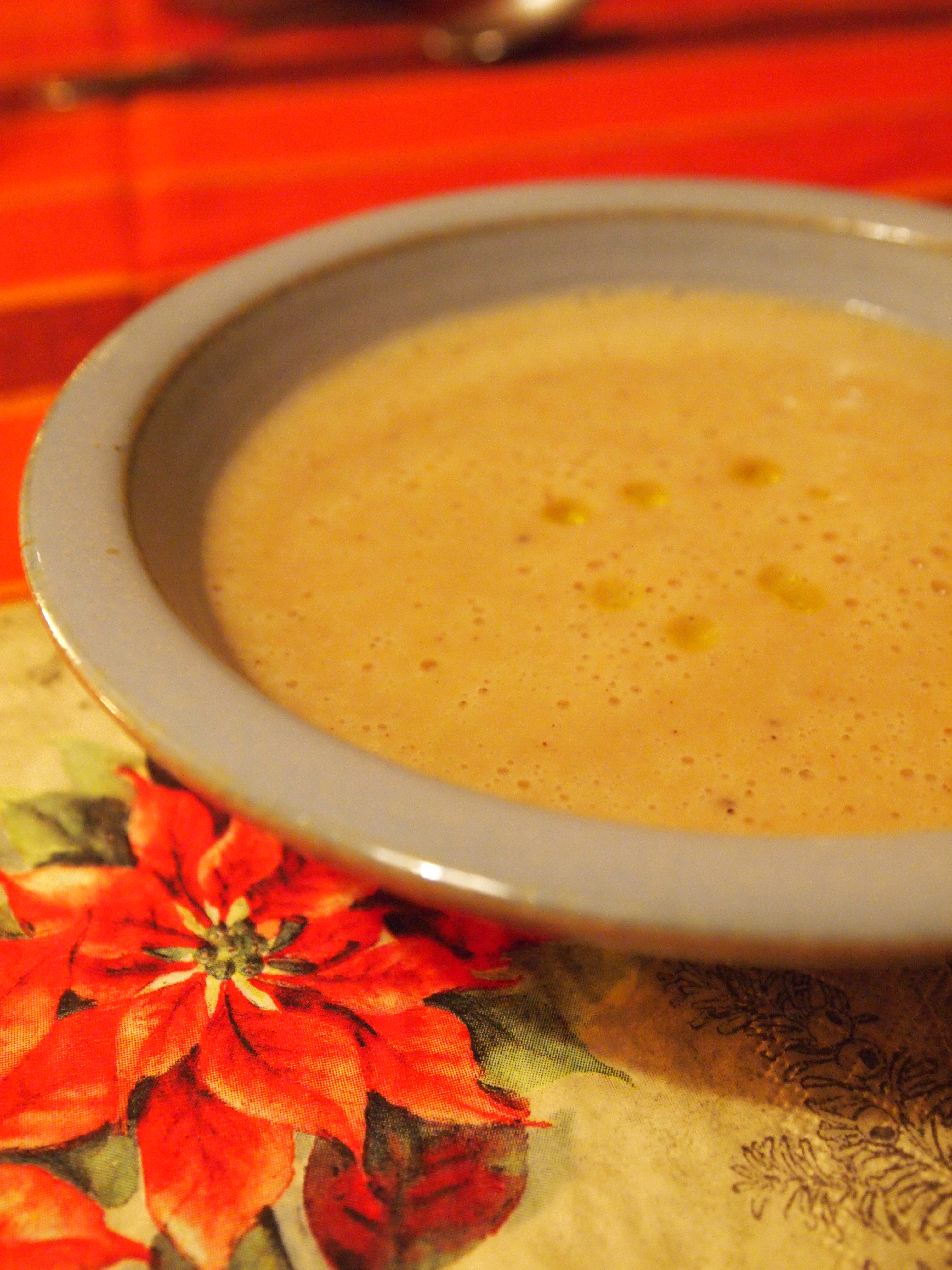 Ein gutes Süppchen als Vorspeise oder auch Hauptgericht kann keiner verwehren. Vor allem dieses hier nicht: Wer Maroni oder Esskastanien mag wird diese Suppe lieben. Abgerundet wird mit Trüffelöl 🙂