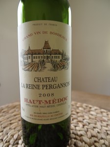 Diese Woche möchte ich euch mal einen Roten aus Frankreich, näher aus dem Haut-Medoc (Bordeaux), vorstellen: Chateau La Reine Perganson 2008. Ein sehr fruchtiger Rotwein, der nach Waldbeeren und Holz duftet. Er hat eine dezente Säure und schmeckt richtig voll und saftig. Einziger Wermutstropfen ist, dass es ihn hier in Deutschland nicht zu kaufen gibt. Auch im Internet habe ich ihn nicht gefunden. Mein Vater hat ihn vor kurzem aus Frankreich mitgebracht und wärmstens empfohlen! Also, wer nächstes Mal in Frankreich unterwegs ist sollte sich unbedingt ein Fläschchen, oder besser eine Kiste, ins Gepäck packen. Preis lag ungefähr bei 6 Euro die Flasche.