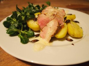 Schweinemedaillons im Currysud pochiert mit Kartoffelspalten und Ackersalat