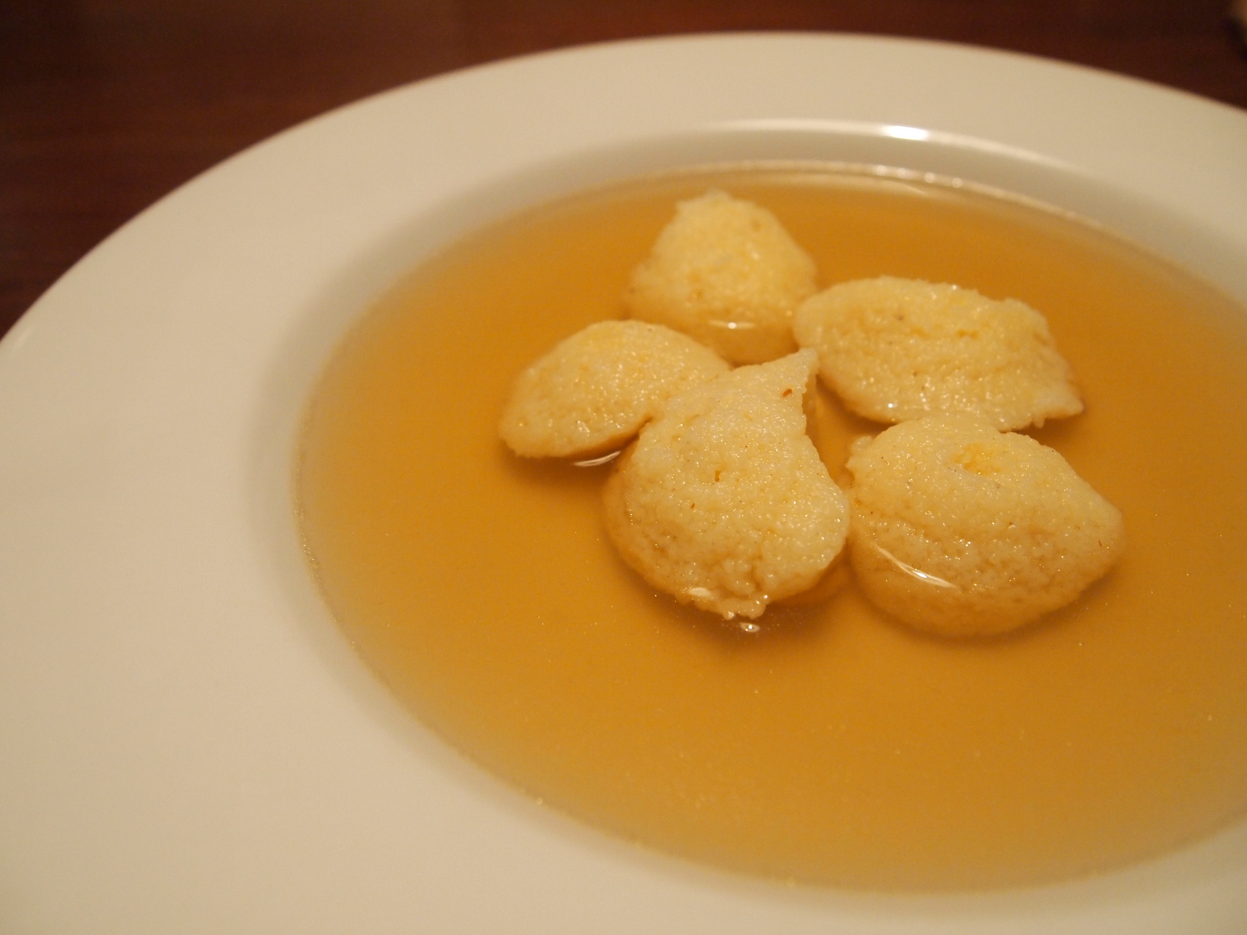 Heute steht mal wieder ein Süppchen auf dem Speiseplan. Wer lieber Geflügel mag, sollte jetzt hier weiterlesen. Gerade richtig für das nass-kalte Dezemberwetter draußen: eine kräftige Rinderbrühe bzw. eine Rinderbouillon. Von einer Bouillon spricht man, wenn die Brühe einfach geklärt wurde, das heißt durch ein Mulltuch gegossen wurde, um die Trübstoffe raus zu filtern, von einer Consommé, wenn die Brühe noch einmal mit Hackfleisch, Eiweiß und Gemüse geklärt wird. Die Zubereitung der Bouillon ist kein Hexenwerk und das Resultat lässt sich mit einer Suppe aus dem Päckchen nicht vergleichen! Das Rezept, das ich euch hier vorstelle ergibt ungefähr 1 1/2 Liter Brühe – so hat man einfach länger was davon. Als Einlage passen sehr gut Grießklösschen.