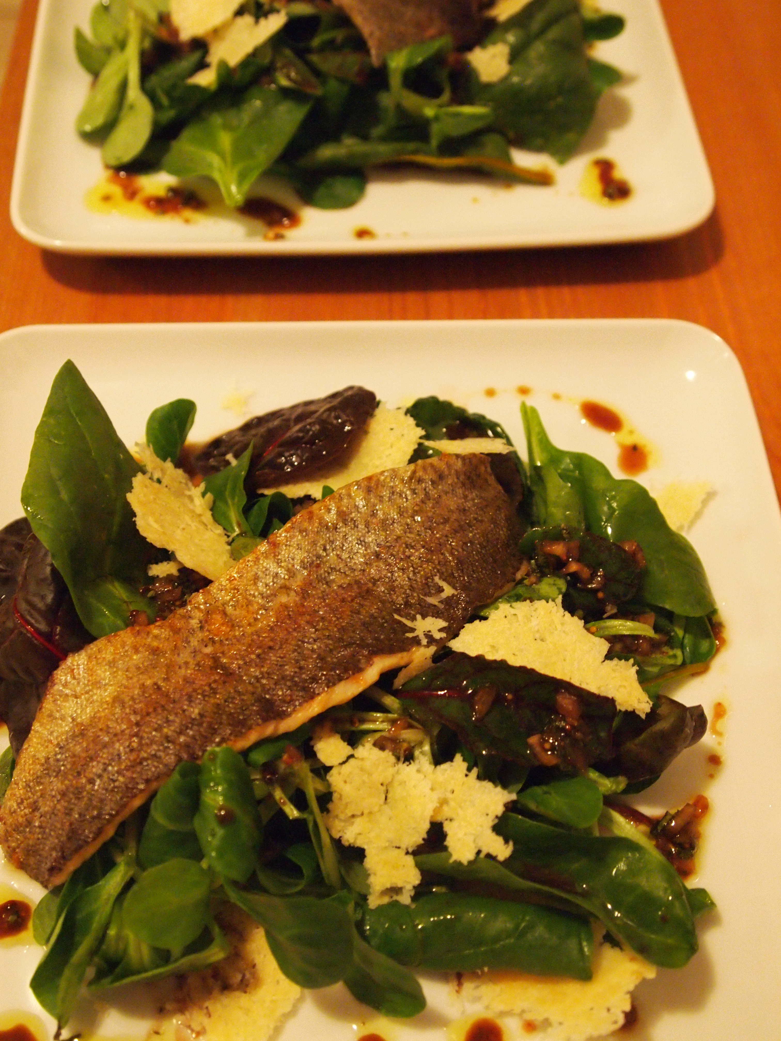 Die Blattsalate waschen und trockenschleudern. Für die Vinaigrette ungefähr 2-3 EL Balsamicoessig mit den Ölen (4-5 EL), etwas Rinderfond (1-2 EL), Senf, feingehackter Petersilie, fein gewürfelten Schalotten, Salz und wenig Pfeffer mit einem Schneebesen vermengen (eine fast schon cremige Sauce soll dabei entstehen – die Cremigkeit hängt auch von der Qualität des Balsamicos ab!). Die Knoblauchzehe halbieren und in der Vinaigrette 10 Minuten ziehen lassen, dann herausnehmen. Für die Parmesanchips geriebenen Parmesan mit Mehl mischen. Eine Pfanne ohne Fett erhitzen und die Parmesanmischung darin flach goldgelb werden lassen. Auf Küchenkrepp legen und abkühlen lassen. Dann in kleine Chips brechen und bis zum Servieren beiseitestellen. Die Forellenfilets trockentupfen und in einer Pfanne bei mittlerer Hitze auf der Hautseite anbraten (Tipps zum perfekten Garen von Fisch siehe hier). Den Fisch wenden, Pfanne vom Herd ziehen und die Filets in der Resthitze der Pfanne glasig durchziehen lassen. Den Salat mit der Vinaigrette anmachen, jeweils ein Fischfilet mit der krossen Hautseite nach oben auflegen und mit etwas Fleur de Sel würzen und mit Parmesanchips bestreuen.