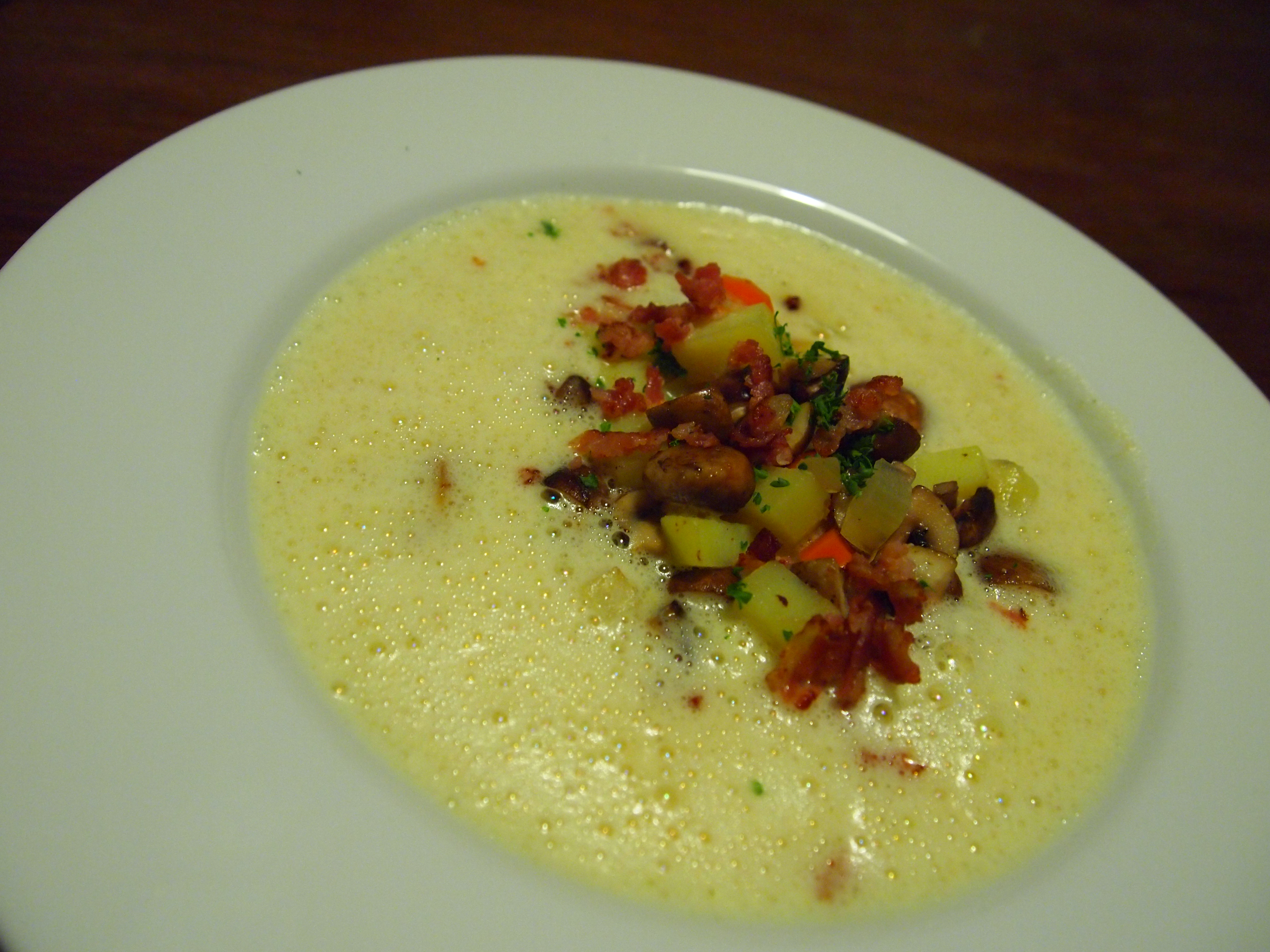 Kartoffelschaumsüppchen mit Pilzen und Speck