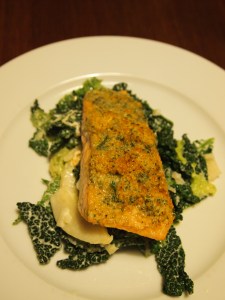 Lachsfilet in der Senfkruste mit Meerrettich-Birnen-Wirsing