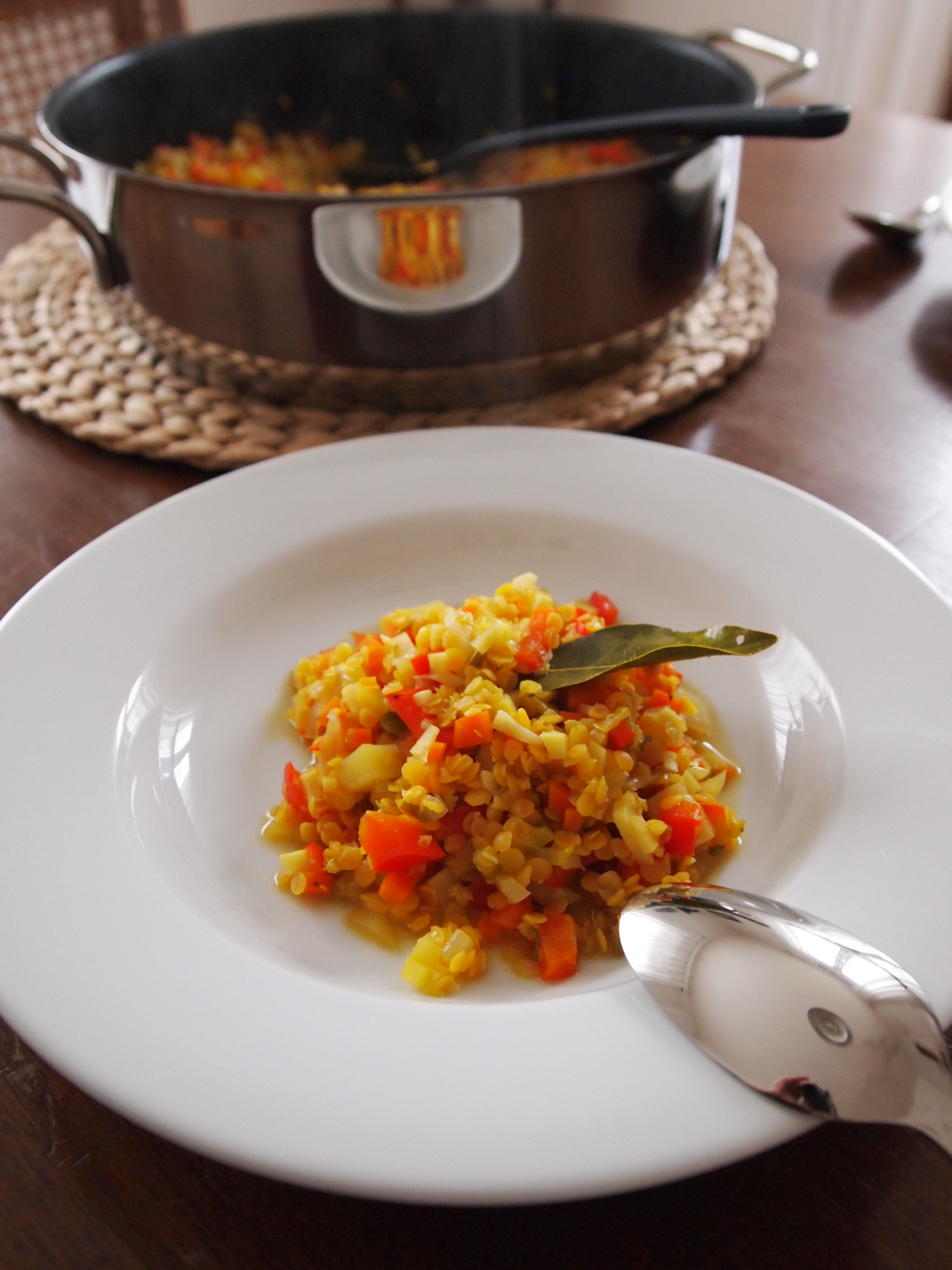 Bei einer derart langen Einkaufliste ist ein Mise-en-place (Bereitstellung der benötigten Gewürze und Zutaten; Abmessen der Flüssigkeiten; Schneiden/Zerkleinern von Gemüse etc.) unbedingt notwendig, um den Überblick nicht zu verlieren. Die Linsen gut waschen und abtropfen lassen. Gemüse putzen und klein schneiden, Knoblauch und entkernte Chili fein würfeln, Ingwer reiben. Das Olivenöl in die Pfanne geben, die mit einem (*) gekennzeichneten Kräuter und Gewürze darin einige Minuten erhitzen, bis sich das Aroma entfaltet hat. Gemüse, Linsen, sowie Knoblauch und Ingwer hinzufügen und kurz ziehen lassen. Schließlich die mit (+) gekennzeichneten Zutaten dazugeben und in ca. 40 min. garen. Am Schluss das frische Koriandergrün schneiden und vor dem Servieren darüberstreuen.
