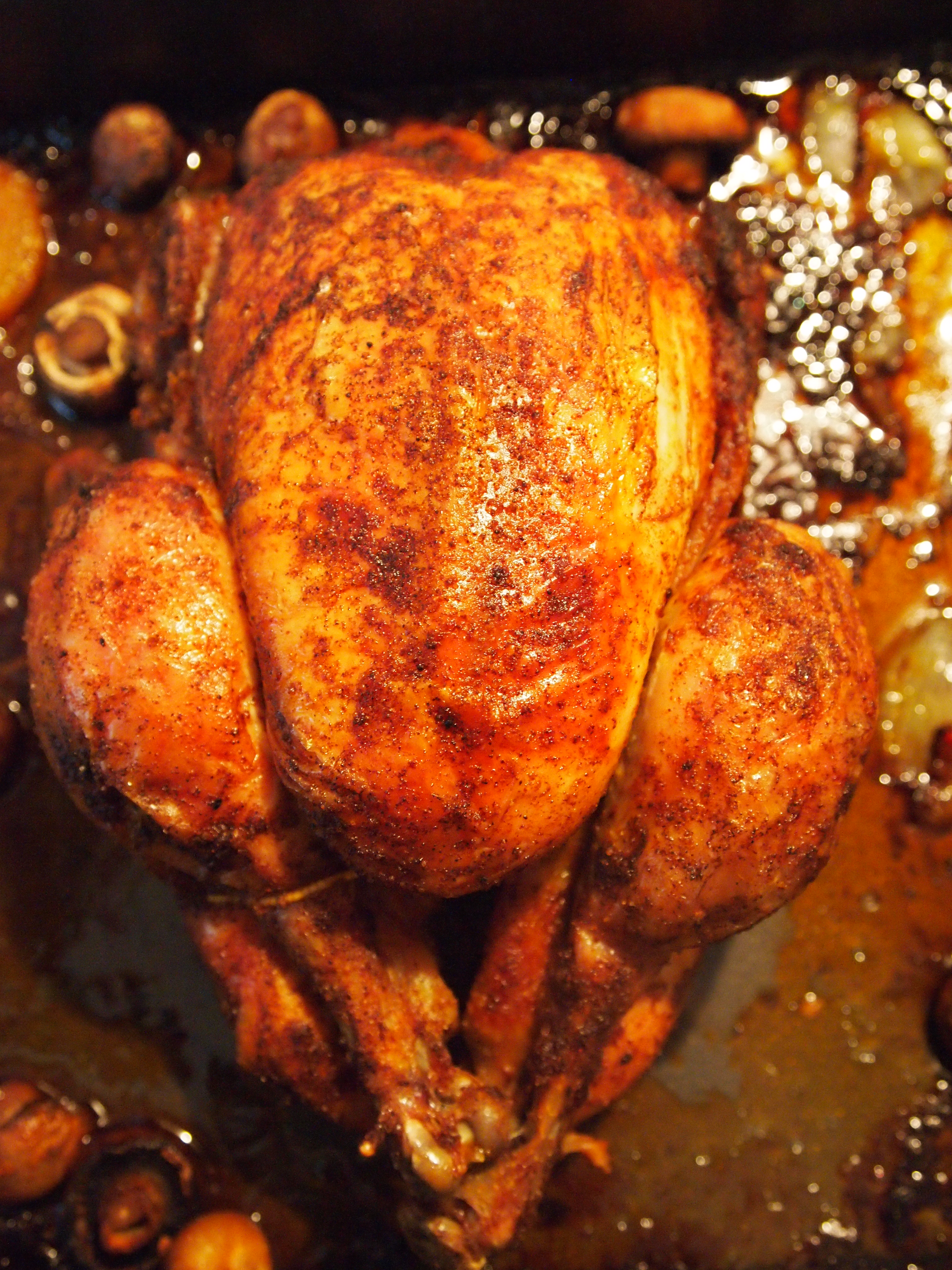 Am besten ein zusammengebundenes Hähnchen kaufen (Bio-Qualität, am besten Freiland). Ansonsten die Keulen mit Küchengarn eng an das Hähnchen binden. Das Hähnchen trockentupfen. Den Ofen auf 200 Grad Ober-Unterhitze vorheizen. Das Öl mit Salz und Paprikapulver vermengen. Pilze putzen und vierteln, Zwiebeln schälen und achteln, Knoblauchzehen schälen. Das Hähnchen mit der Brust nach unten in einen großen Bräter legen, Pilze, Zwiebeln und Knoblauch rund um das Hähnchen verteilen und den Geflügelfond dazugießen (nicht über das Huhn, sondern seitlich angießen). Das Hähnchen mit einem Teil des Paprikaöls einpinseln. Den Bräter auf die mittlere Schiene in den Ofen stellen und 30 Minuten braten. Dann das Hähnchen wenden und noch ungefähr 1 Stunde garen. Während dem Braten immer wieder mit dem Öl einpinseln, bis das Öl aufgebraucht ist. Zum Schluss die Bone Suckin‘ Yaki-Sauce (z.B. zu bestellen bei otto-gourmet.de, siehe Blogroll) in den Bratensatz einrühren. Diese Sauce kann auch weggelassen werden, verleiht dem Ganzen aber den „letzten Kick“!