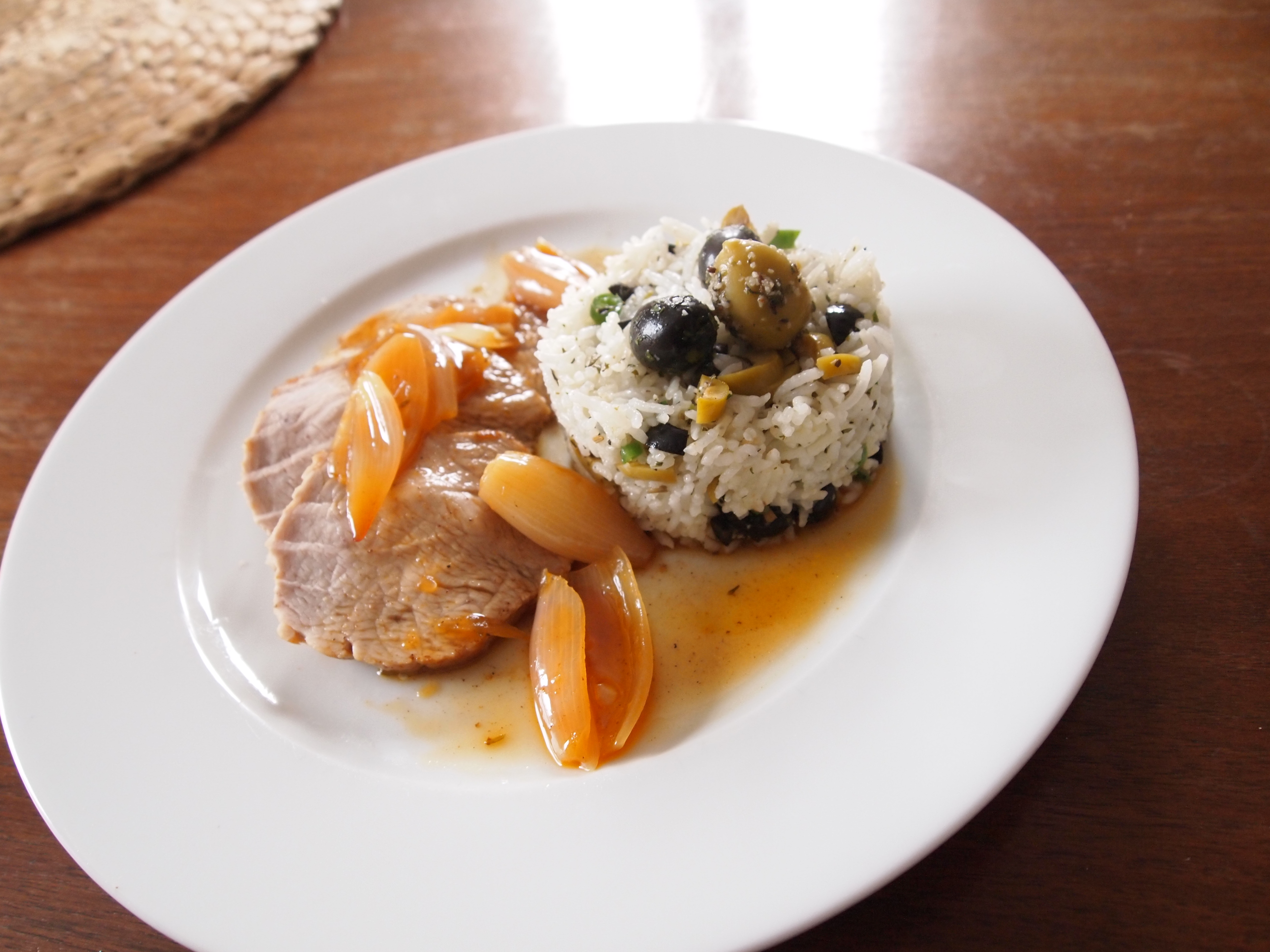 Kalbsnuss geschmort, Schalotten und Oliven-Reis