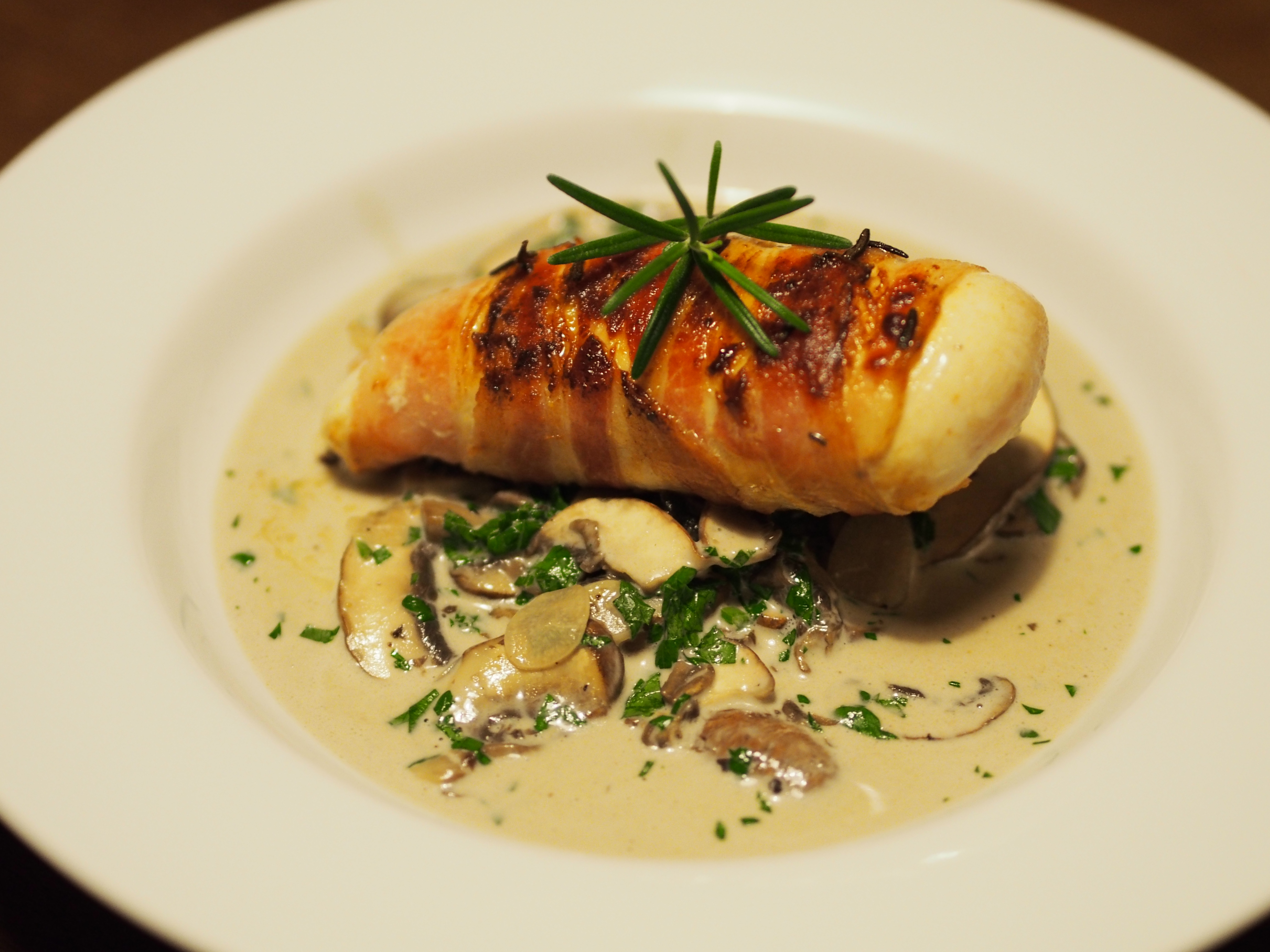 Maishähnchenbrust im Speckmantel mit Pilzsoße