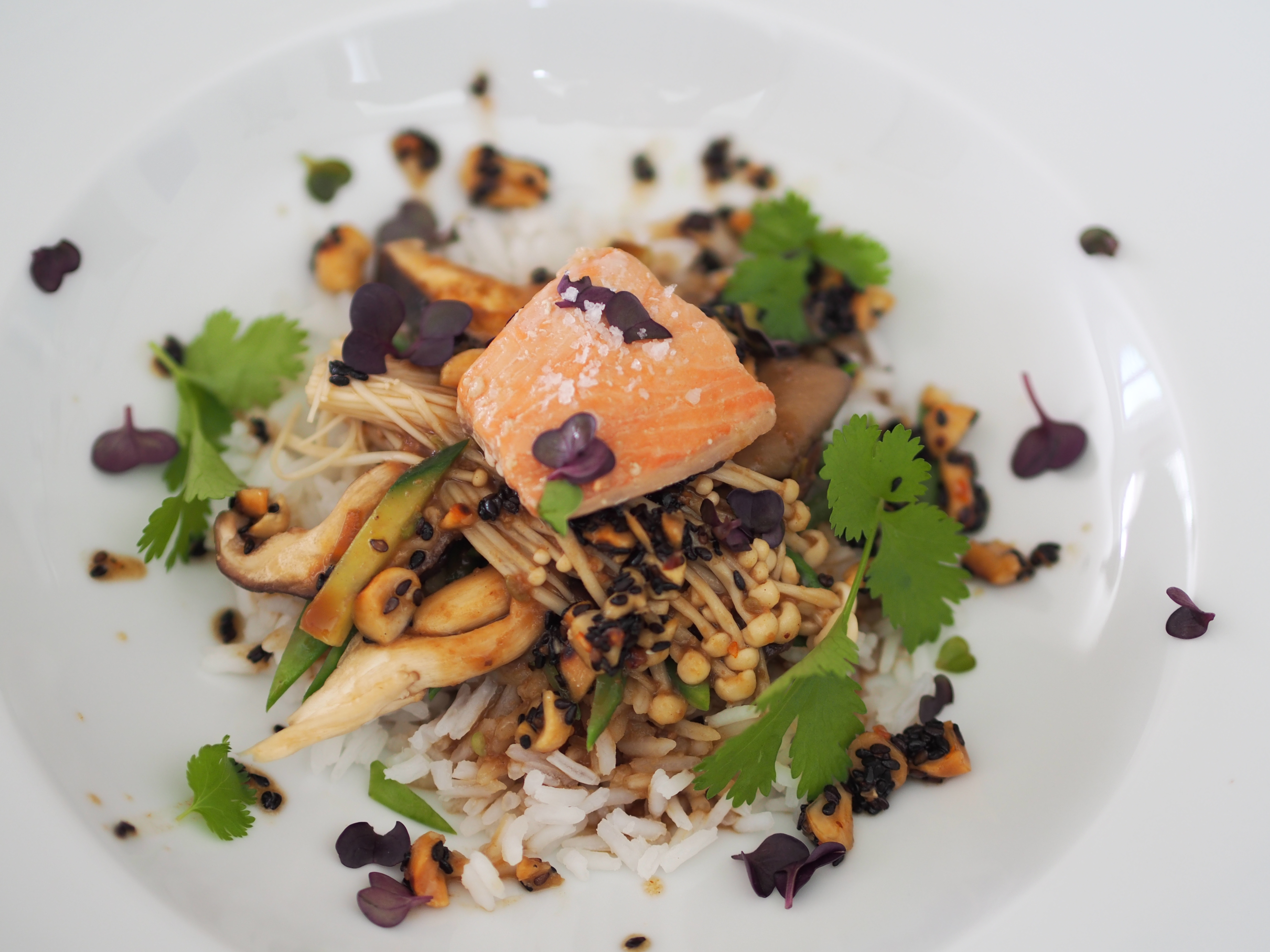 Den Reis nach gewünschter Methode garen. Für das Dressing Erdnusskerne rösten und grob hacken und mit schwarzem Sesam, Reisessig, Ahornsirup, Erdnussöl und Chiliflocken gut verrühren. Lachs in schmale Stücke schneiden und mit 2 EL Olivenöl, 1 EL Sesamöl, 2 EL Tamarisauce und 1 EL Mirin in einen gut verschließbaren Beutel geben (dabei die Luft so gut es geht aus dem Beutel drücken, sprich „Vakuum schaffen“). Kurz vor dem Servieren den Beutel mit dem Lachs in ein ca. 60 Grad heißes Wasserbad geben und in ungefähr 10-15 Minuten (je nach Dicke des Fisches) garen. Die Marinade aus dem Beutel kann zum Teil auch, je nach Geschmack, mit dem Sesamdressing vermengt werden. Buchenpilze in kleine Portionen teilen, Shitakepilze in Streifen schneiden, Gurke und Zuckerschoten in streichholzgroße Stäbchen. In einem Topf 380ml Wasser mit Dashipulver, 1 EL Tamari, 1 1/2 EL Mirin, 30g Miso und 1 1/2 TL Zucker zum Kochen bringen, dann auf mittlere Temperatur stellen. Zunächst die Pilze zugeben, 3 Minuten garen, mithilfe einer Schaumkelle herausheben und in einer Schüssel warmhalten. Zuckerschoten zugeben und 1 Minute garen, herausheben und in die Schüssel geben. Gurke zugeben und nur 15 Sekunden garen, ebenfalls herausheben und zur Schüssel geben. Den Topf mit der Garflüssigkeit wieder zum Kochen bringen und in ca. 10 Minuten auf gut 50ml einkochen lassen – daran denken, das Gemüse warmzuhalten (aber nicht mehr weitergaren lassen!). Zum Anrichten etwas Reis in tiefe Teller geben, Gemüse darauf anrichten, mit reduzierter Garflüssigkeit begießen, anschließend mit dem Sesamdressing. Den gegarten Lachs oben aufsetzen, evtl. mit etwas Fleur de Sel salzen und mit Koriandergrün und Kresseblättchen garnieren.