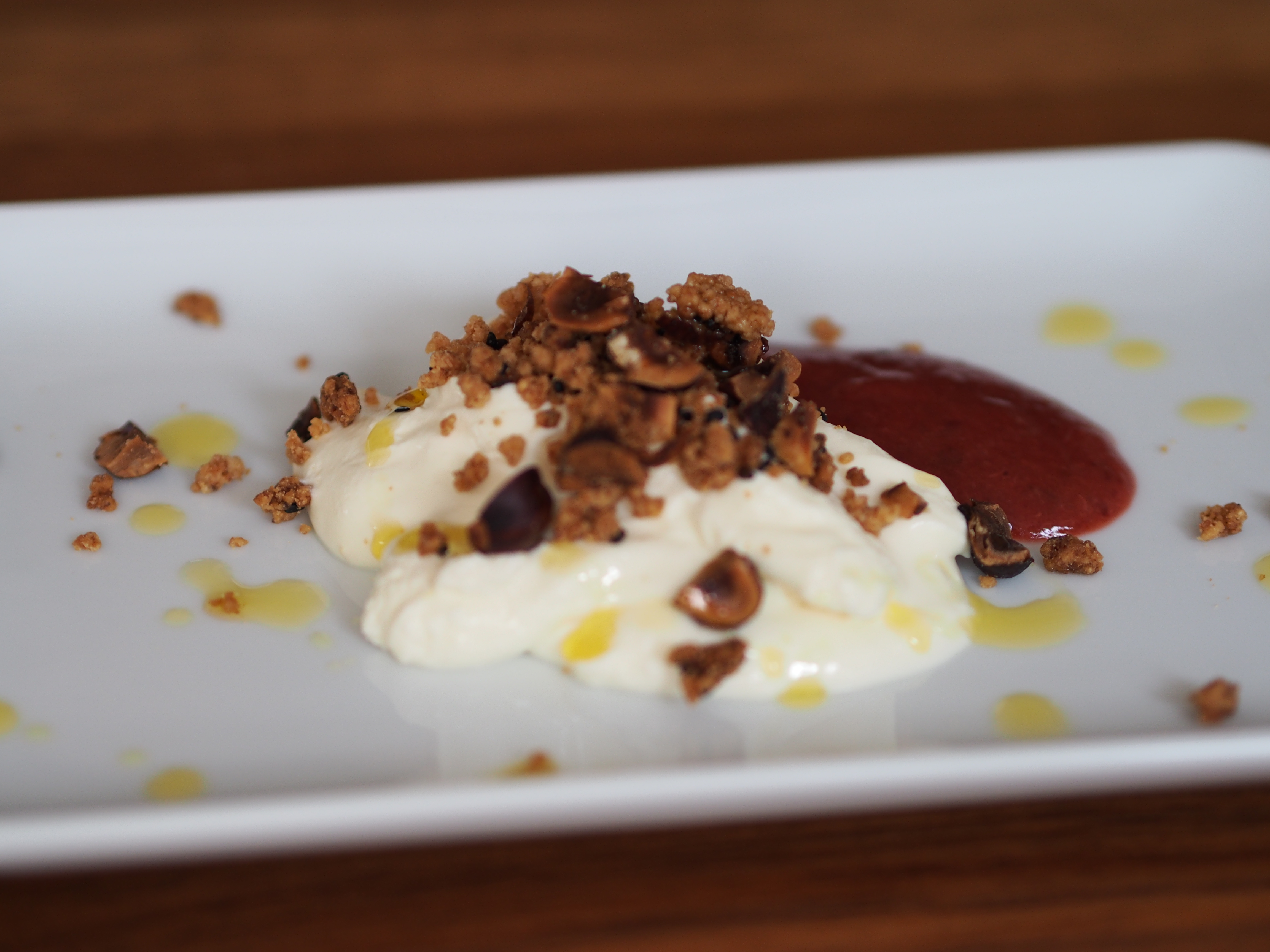Käsekuchencreme, Nuss-Sesamcrumble, Pflaumen und Orangenöl