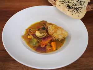Hähnchenteile (Haut dranlassen!) in einem Topf mit Wasser bedecken und mit 6 angedrückten Kardamomkapseln aufkochen. Ungefähr 30 Minuten simmern lassen, bis das Fleisch gar und saftig ist. Dabei den Schaum mit einer Schaumkelle abheben. Fleisch herausheben, Hühnerbrühe behalten (!) und Fleischteile in einer Schüssel mit dem Tandoori-Gewürz und Salz mischen. Kurkuma, Knoblauch, Galgant, Ingwer in feine Scheiben schneiden. Zwiebeln achteln. Karotte und Süßkartoffel vierteln und dann mundgerecht stückeln. Tomate fein würfeln. 2 EL Ghee in einer großen Schwenkpfanne oder Wok erhitzen, Curryblätter und 4 angedrückte Kardamomkapseln hinzugeben und ca. 2 Minuten rösten. Kurkuma, Galgant, Ingwer und Knoblauch zugeben und anrösten. Zwiebeln dazu, dann die Karotte und die Kartoffeln, ebenso die gehackte Chilischote. Nach und nach Hühnerbrühe dazugießen und leicht einreduzieren. Auberginen vierteln und mit Kokosmilch und Tomatenwürfeln unterheben. Stark aufkochen, vom Herd nehmen und mit Salz, Garam Masala und Tamarindenpaste (Vorsicht, sauer!) abschmecken. Hühnerteile in einer Pfanne in heißem Ghee kurz kross braten (v.a. die Haut). Dann in das Curry geben. Für das Naan-Brot Zucker, Prise Salz und Hefe in lauwarmer Milch lösen. Mehl auf eine Arbeitsfläche geben, eine Mulde mittig formen und die Hefemischung eingießen und unterkneten. Zusätzlich dabei etwas warmes Wasser einkneten bis ein homogener Teig entsteht. Mit feuchtem Küchentuch bedecken und 20 Minuten gehen lassen. Dann 1 1/2 EL flüssiges Ghee einkneten und weitere 2 Stunden abgedeckt gehen lassen. Ofen auf 200 Grad Umluft vorheizen. Teig in vier Teile teilen und zu flachen Fladen ziehen, mit flüssigem Ghee bestreichen und Kümmel bestreuen – dabei den Kümmel etwas andrücken, da er sonst beim Backen abfällt. Die Fladen ca. 10 Minuten backen.