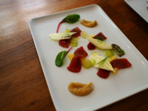 Für das Knoblauch-Meerettichpüree den Ofen auf 150 Grad heizen. Die Knoblauchzehen in der Schale in Olivenöl schwenken (gut 30ml), in Alufolie wickeln und für eine Stunde in den Ofen geben. Zehen leicht abkühlen lassen, dann schälen und zusammen mit den Meerettichwürfelchen und der Sojasauce in einen Standmixer geben. Während der Mixer läuft etwa 100ml Olivenöl langsam einlaufen lassen – stoppen, wenn die gewünschte Konsistenz erreicht ist. Nicht salzen, die Sojasauce ist salzig genug. Das Püree abschließend durch ein feines Sieb streichen.