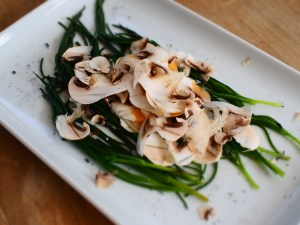 Mönchsbart gut unter kaltem Wasser abspülen und die unteren braunen Wurzeln entfernen. Trockentupfen und in etwas Olivenöl in einer Pfanne andünsten. Etwas Wasser zugeben, Deckel auflegen und für 1 Minute dämpfen. Herausnehmen und auf Teller verteilen. Champignons mit einer Mandoline hauchdünn darüberhobeln. Abschließend mit Chiliöl und schwarzen Salz würzen. Fertig.