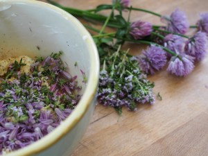 Kräuterbutter mit Schnittlauchblüten, Thymianblüten und Rotklee