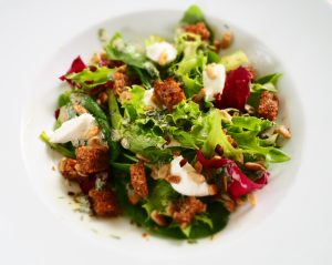Sommerlicher Salat mit Croutons, Sonnnenblumenkernen und Dilldressing