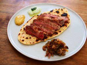 Gegrilltes Nackensteak vom Mangalitza-Schwein, Taco, Auberginen-Pickle, Dips