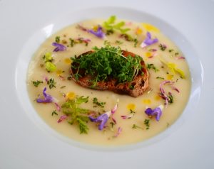 Die Pastinaken und die Kartoffel schälen und in Stücke schneiden. Mit etwas Wasser und Salz in einen Topf (oder den Thermomix) geben und weich kochen. Anschließend mit der Sahne und einem Klecks Butter zu einem feinen Püree mixen. Abschmecken und warmhalten. Das Grün von der Wiese waschen (außer die Blüten, da sie sonst das Aroma verlieren), auf Küchenpapier trocknen lassen. Püree in tiefe Teller geben, in die Mitte eine geröstete Scheibe Brot setzen und Kresse darauf geben. Mit den Blüten, Samen und Trieben nach Belieben ausgarnieren und abschließend mit etwas Rapsöl beträufeln.