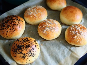 Alle Zutaten abmessen und bereit stellen. Milch in einem Topf erwärmen, 1 EL Zucker und 1 EL Mehl 550 zugeben, dann die Hefe und verrühren (Zucker, Mehl und Wärme geben der Hefe den „Startkick“). In einer Schüssel die weiche Butter mit beiden Mehlen und dem Salz mischen. Anschließend die Hefe-Milch-Mischung und das Ei einarbeiten. Nach und nach das Wasser zugeben. Gute 10 Minuten kneten, bis der Teig glatt und elastisch ist! Eventuell mit Mehl oder Wasser „nachjustieren“, aber erst nach 5 Minuten kneten. In der Schüssel mit Klarsichtfolie abdecken und 1,5 Stunden gehen lassen. Dann den Teig in 8 Stücke teilen und jeweils 8 schöne runde Kugeln formen. Auf ein mit Backpapier belegtes Blech legen, wieder mit Klarsichtfolie abdecken und nochmals 1 Stunde gehen lassen. Ofen auf 200 Grad vorheizen. Buns mit der Glasur bestreichen und nach Belieben mit Toppings bestreuen. Im Ofen 15-20 Minuten backen bis die Oberfläche goldbraun ist. Blech aus dem Ofen holen, abkühlen lassen und dann bis zur Verwendung mit einem Küchentuch abdecken. Können auch super eingefroren werden!