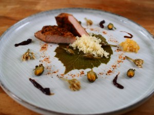 Zum Servieren mittig ein Haselnussblatt legen. Darauf etwas Couscous und das schräg halbierte Steak geben. Eingelegtes hübsch anrichten, z.B. die Bärlauchknospen öffnen, dann sieht man die winzigen Blütenstände, oder ein Teil der Löwenzahnknospen halbieren. Abschließend mit roten Zwiebeln garnieren und etwas Pull that Piggy-Rub bestreuen.
