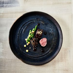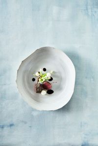Heiko Antoniewicz und Ludwig Maurer werden beide im Verlauf des Buches und meines Textes als HA und LM abgekürzt – das übernehme ich im folgenden auch. Für HA ist es sein 11. erschienenes Buch, unter denen mich sein vegetarisches „Green Glamour“ mit seinen vielfältigen Ideen zur Verwendung bekannter und unbekannter Gemüsesorten sehr beeindruckt hat. Aus jedem Gemüse wird sein eigenes Aroma quasi herausgekitzelt und dabei weitestgehend auf tierische Produkte wie Sahne oder Butter verzichtet, die doch als Fett- und damit auch Geschmacksträger den Koch herausfordern, wenn er sie weglässt. Das erklärt auch, warum manche Vertreter der Gemüseküche wie zum Beispiel Köthe & Ollech aus dem Nürnberger „Essigbrätlein“ in ihren Rezepten fast schon verschwenderisch mit Sahne umgehen, dient es m.E. aber wenig dazu den Eigengeschmack von Gemüse zu heben – das machen subtilere Küchen, wie zum Beispiel die japanische, bei der sich HA auch gerne bedient, besser. Der zweite Autor: Ludwig „Lucki“ Maurer. Er verfasste bereits drei Bücher, die sich mit der ganzheitlichen Verarbeitung des Lebensmittels Fleisch beschäftigen und wurde dafür mehrfach ausgezeichnet. Er arbeitet als Autor und Food Stylist für führende Magazine in der Kulinarikszene. Im „Wilden Wald“ findet sich seine Nose-to-tail-Philosophie in Gerichten wie „Aufbruch“, Reh, Meerrettich (im Buch auf Seite 122/123) wieder, wo ein Rehragout aus Lunge, Herz und Leber serviert wird. Und da kommen wir zu einem Problem des Buches, nämlich das der Konsequenz! Eine konsequente Verschreibung dem Nose-to-tail-Prinzip gegenüber, müsste auch dessen Fortführung in den anderen Rezepten des Buches sein – was es kaum tut. So werden Rehrücken, Hasenrücken, Entenbrüste, Wachtelbrüste, Fasanenbrüste verwendet, also die uns alten bekannten Edelteile. Da hätte LM bei der Auswahl der Fleischcuts gerne mehr „Exotik“ walten lassen können.