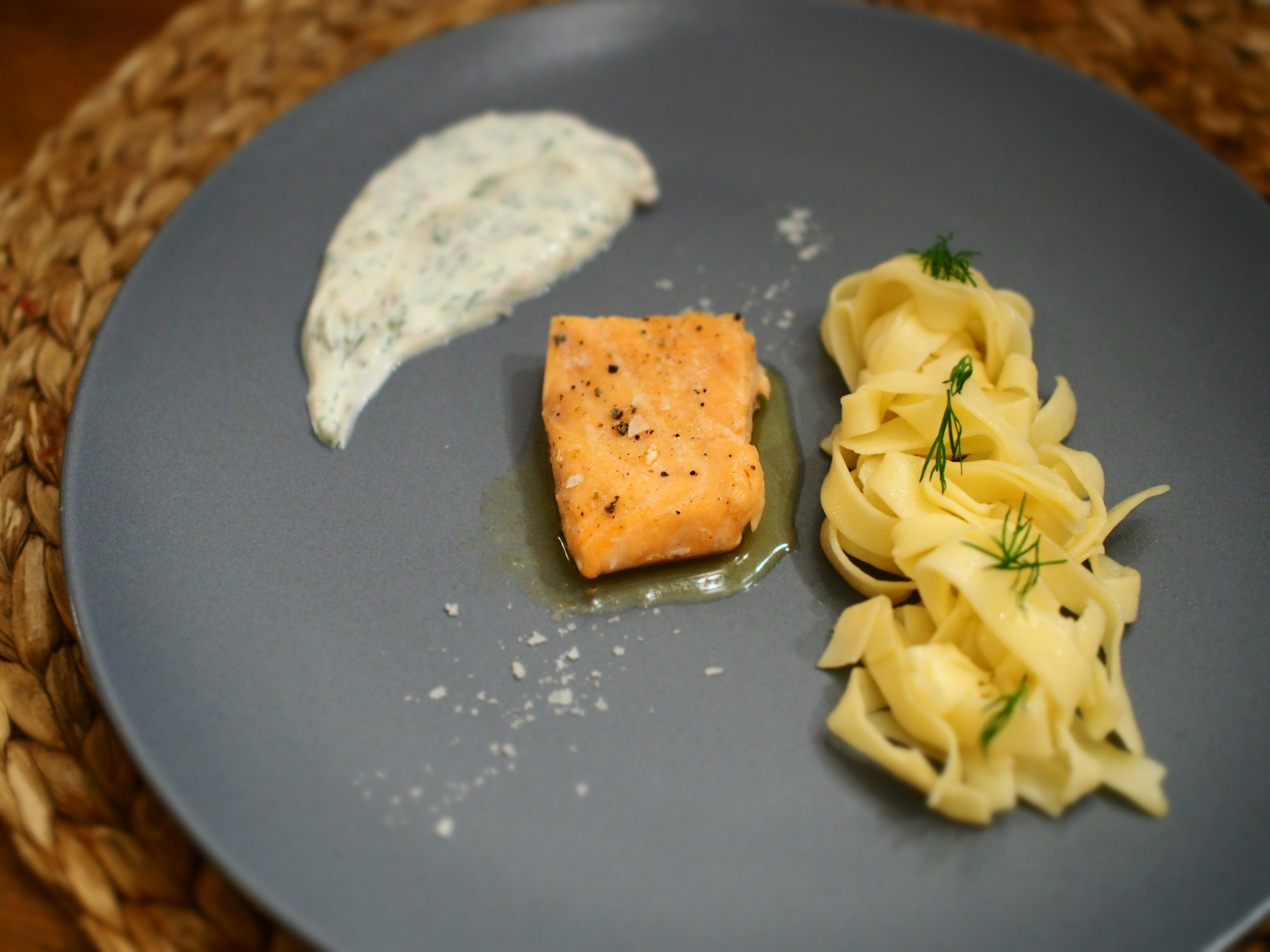 Lachs, Albaöl, Tagliatelle, Dillquark