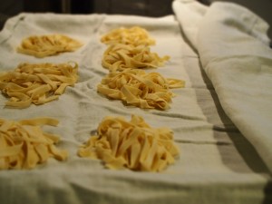 Für den Nudelteig Grieß mit 130ml Wasser, 3g Salz und 1 EL Olivenöl zu einem homogenen Teig verarbeiten. Das geht gut mit den Händen und einer großen Schüssel. Wenn sich alle Zutaten zu einem glatten Teig vermengt haben, Teigkugel in ein Plastikbeutel oder in eine Plastiktüte wickeln und eine Stunde bei Raumtemperatur ruhen lassen. Dann mit der Nudelmaschine und dem Tagliatelle-Aufsatz Pasta herstellen (dabei Anleitung des Maschinenherstellers beachten).
