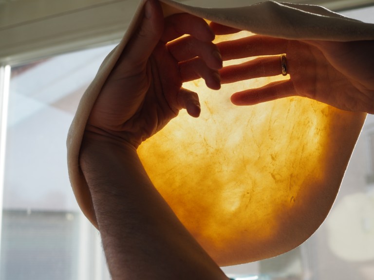 Für den Teig würde ich euch sehr die PizzApp empfehlen: im Playstore hier kostenlos zum Runterladen. Mit dieser App könnt ihr euch euren Teig frei konfigurieren und entscheiden, ob ihr eine römische oder napoletanische Pizza wollt, ob ihr Trockenhefe oder frische Hefe verwendet, wie lange ihr den Teig gehen lassen wollt (und bei welcher Temperatur)… Ihr könnt auch eure Konfigurationen abspeichern. Super Sache! Ganz wichtig ist es in allen Fällen, dass ihr das Mehl mit der Type 00 oder tipo 00 nehmt. Denn „normales“ Weizenmehl hat oft einen Glutengehalt von nur 7-9 Prozent, Pizzamehl aber hat einen viel höheren Glutengehalt von 10-14 %. Dieser hohe Glutengehalt ist ideal für das Zubereiten von Pizzateig, denn die Gluten, auch als Kleber-Eiweiß bezeichnet, sorgen dafür, dass der Teig beim Rundziehen elastisch und belastbar wird und später im Ofen gut aufgeht. Ein Bild vom Rundziehen des fertigen Teiges verdeutlicht euch, wie elastisch der Teig sein kann: