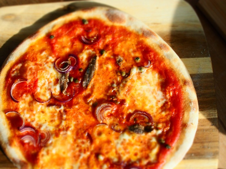 In diesem Beitrag möchte ich euch das Pizzabacken näher bringen. Auf meinem Blog habe ich schon einmal ein Rezept für Pizza Margherita eingestellt, aber da man nie auslernt, habe ich mittlerweile nach vielen missglückten und geglückten Selbstversuchen mit diversen Pizzateigen, den „Dreh“ raus. Jetzt würde ich sagen, dass sich mein Ergebnis in puncto Pizzabacken durchaus sehen und schmecken lassen kann. Die erste Frage die man sich stellen muss, wenn man eine Pizza selbst machen will: möchte ich eine Pizza Napoletana oder eine Pizza Romana? Die eine Variante kommt wie der Name schon sagt aus Neapel, die andere aus Rom. Die Napoletana ist vom Teig her viel weicher, fluffiger als die Romana. Sie hat vor allem einen höheren Rand („bordo alto“) der auch breiter ist als bei einer römischen Pizza. In Rom ist die Pizza dünner, knuspriger, wird bei ca. 300 Grad gebacken und wird typischerweise „al taglio„, also stückweise auf die Hand, verkauft. So, wie sie in Neapel gebacken wird – bei 485 Grad, nicht länger ca. 90 Sekunden über Holzfeuer -, hat sie zudem einen besonderen Status. Die Unesco nahm kürzlich die Kunst des Pizzabackens in die Liste des immateriellen Kulturerbes auf. Ich persönlich bevorzuge die Napoletana und zeige euch daher diese Variante. Belegt habe ich sie hier neben den Klassikern Tomatensoße (Rezept siehe unten) und Mozzarella mit roten Zwiebeln, Kapern und Sardellen: