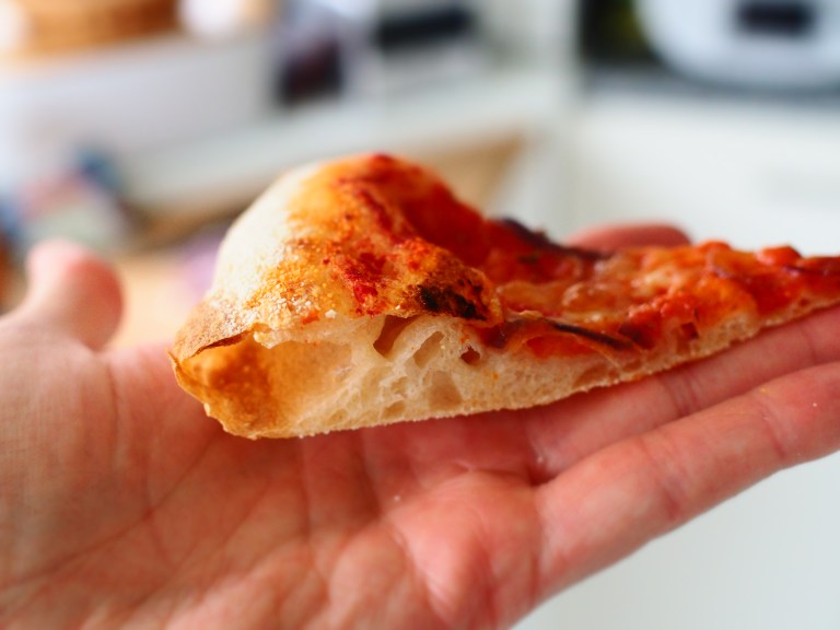Der Teig in meinem Beispiel benötigt insgesamt 1 1/2 Tage (36 Stunden) zum Gehen. Daher braucht man auch nur ein winziges Stück Hefe. Vergesst die 0815 Teige, die 1/2 Würfel Hefe verwenden, damit der Teig nach 30 Minuten aufgegangen ist wie ein Hefezopf. Auf diese Weise gelingt kein Teig, der von der Konsistenz und dem Geschmack her dem Original entspricht. Gute Brotteige reifen übrigens nach dem gleichen Prinzip und benötigen kaum Hefe. Achja: frische Hefe könnt ihr gut einfrieren, da ihr in diesem Rezept nur 0,5g brauchen werdet (ein Würfel sind 42g!). Die Tomatensoße ist im Gegensatz zum Teig schnell gemacht. Ihr müsst nicht stundenlang eine Soße köcheln. Einfach gute Dosentomaten hernehmen. Die Sorte San Marzano ist ideal, da am geschmackvollsten. Frische Tomaten eignen sich weniger, da bieten Dosentomaten mehr Geschmack, da sie zum optimalen Zeitpunkt geerntet und konserviert wurden. Tomaten in ein Mixgerät geben oder pürieren, mit Salz und etwas Pfeffer abschmecken, fertig. Mehr braucht es nicht.