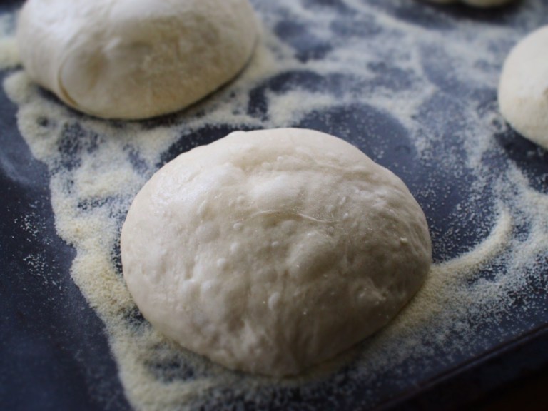 Für den Teig das Mehl in eine große Schüssel geben. Wasser abwiegen und davon 2 EL Wasser abnehmen und die Hefe darin auflösen. Das Wasser und das Salz zum Mehl geben, dann das Hefewasser dazu schütten und alles mit den Händen zu einem Teig verarbeiten – der Teig klebt anfangs, wird aber mit der Zeit fester und formbarer (ca. 10 Minuten kneten). Schüssel mit Frischhaltefolie oder passendem Deckel abdecken und 6 Stunden bei Raumtemperatur stehen lassen. Dann den Teig nochmal bearbeiten, so dass Luft in den Teig kommt und der Hefe somit Nahrung bietet. Nach weiteren 6 Stunden den Vorgang wiederholen. Über Nacht ruhen lassen (dabei die Schüssel immer abdecken, sonst trocknet der Teig aus!). Am nächsten Tag den Teig nochmals bearbeiten, wieder 6 Stunden ruhen lassen. Dann in vier gleich große Stücke teilen. Jedes Stück einzeln zu Kugeln formen (evtl. etwas Mehl verwenden, falls zu klebrig) und Kugeln mit Abstand auf ein Backblech, das mit Weichweizengrieß bestreut wurde, setzen. Mit Frischhaltefolie oder einem feuchten Tuch abdecken und weitere 2-3 Stunden ruhen lassen. Idealerweise sollte man jetzt die Bläschen im Teig sehen: