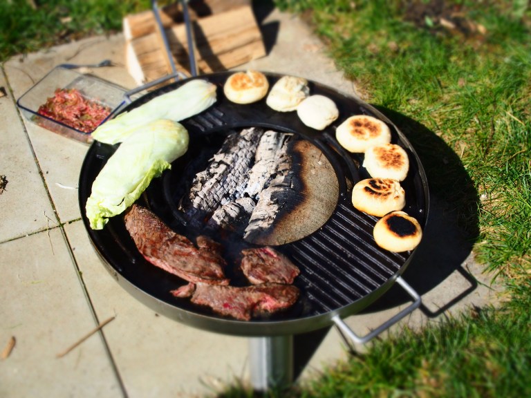 Als Gargut wollte ich mal gegrillten Spitzkohl ausprobieren, das Rezept dafür habe ich aus dem tollen Kochbuch „Immergrün – Die nordische Gemüseküche“ von Mikkel Karstad entnommen. Der Spitzkohl wird gegrillt und mit einem Dressing aus roten Zwiebeln, Honig und Johannisbeeren angemacht (das Dressing seht ihr im Hintergrund warten). Als Fleisch habe ich ein Hanging Tender genommen, auch Onglet oder Nierenzapfen genannt. Super zartes, saftiges und vor allen Dingen schmackhaftes Stück vom Rind. Einer meiner Favorites vom Grill – ihr findet Rezepte mit diesem besonderen Cut auf meinem Blog hier oder hier. Gewürzt nur mit gutem Salz und Pfeffer. Als Beilage habe ich Calzone-Brötchen gemacht, quasi ein Stockbrot-Teig, gefüllt mit Mozzarella, in Öl eingelegten getrockneten Tomaten und Oregano. Hier sind die Rezepte: