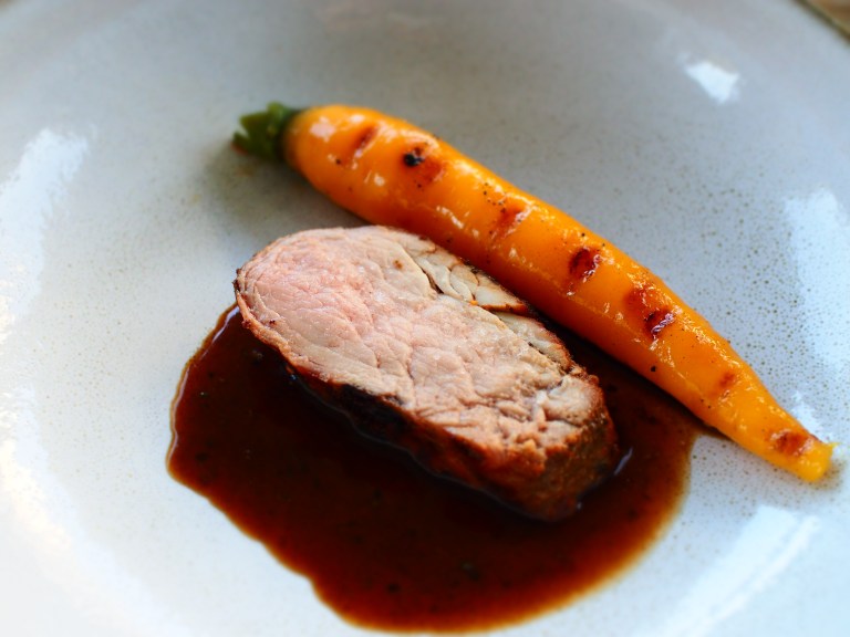 Medaillon vom Schwein, gegrillte Karotte, Dip-Fond