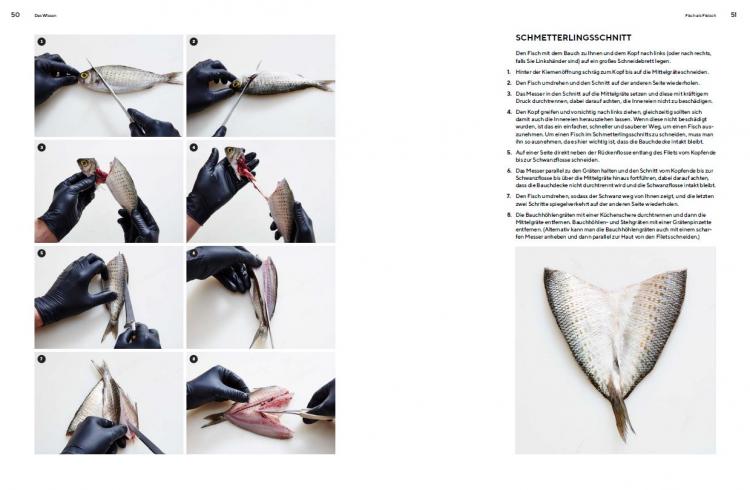 Ein weiteres Kapitel ist mit „Fisch als Fleisch“ als tituliert, in dem Niland zeigen möchte, dass das Potenzial von Fisch weitaus mehr ist, als nur dessen Filet herzunehmen und den Rest, also Kopf und Karkasse noch maximal als Fischfond anzusetzen. Für viele Köche mag das schon das Verständnis von Abfallvermeidung sein, Niland zeigt uns aber ganz andere Dimensionen auf, auch wenn man Fisch als Fleisch betrachtet: Fisch kann wie Fleisch trockengereift oder gepökelt werden, um Geschmack und Textur zu verbessern. Auch die Herstellung von Wurst oder die Verarbeitung von Innereien ist möglich und wird in der Fish Butchery tagtäglich zelebriert. In diesem Kapitel ist auch die oben abgebildete „Explosionszeichnung“ eines zwei Tage gereiften, zerlegten „Wrackbarschs“ abgedruckt. Auf den Folgeseiten wird man als Leser detailliert step-by-step zum Zerlegen angeleitet. Zum Beispiel wie man richtig filetiert, oder einen Schmetterlingsschnitt durchführt. Das ist wichtig, denn in den meisten Rezepten im zweiten Teil des Buchs wird mit diesen Cuts gearbeitet. Was an dieser Stelle etwas schade ist, dass man nicht gezeigt bekommt, wie man zum Beispiel ein Stiel- oder Filetkotelett oder einen Kragen schneidet, wenn diese Cuts doch in mehreren Rezepten auftauchen. Was mich dennoch als Laie beruhigt: mit Fischfilets lassen sich dennoch die meisten Gerichte kreieren – im Buch findet man da etliche, vor allem im Kapitel „Roh, gepökelt & eingelegt“.