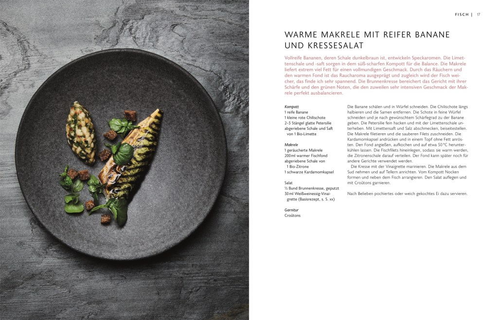 Im Zentrum seiner Gerichte steht das Spiel der Aromen als Grundregel des ausgewogenen Geschmacks. In jedem Gericht sollten daher immer süß, salzig, sauer, bitter und umami angesprochen werden. Und wie gelingt das in der Praxis? Da wären zum einen aromatisierte Öle, geschmacklich dichte Fonds, Sojasoße und Tomatenkonzentrat (Antoniewicz‘ treuer umami-Begleiter tomami!). Dazu kommt die Kombination verschiedener Aromen und Konsistenzen. Unterschiedliche Garmethoden wie Dünsten, Pochieren, Braten oder Grillen beeinflussen und verändern zusätzlich gezielt den Geschmack der Zutaten. Und letztlich spielt die Temperatur der einzelnen Komponenten auf dem Teller eine nicht zu vernachlässigende Rolle im Spiel der Aromen. Bei der Kombination von Aromen beruft sich Antoniewicz wieder auf das Flavour Pairing-Prinzip, dem er schon 2013 ein eigenes Werk gewidmet hat (matthaes, 2013). Nach diesem Prinzip werden Geschmacksfamilien gebildet, welche im „Geschmacksthesaurus“ mit Rezepten, Ideen und Kombinationen für die kreative Küche ausgearbeitet werden. Sein Flavour Pairing-Buch von 2013 richtete sich aber noch eindeutig an Profiköche, da zum Beispiel eine Grapefruit in Stickstoff gegart werden soll und Küchen/Laborgeräte wie Rotationsverdampfer und Ultraschallgeräte (u.a. zur Extraktion) verwendet wurden. Von dieser abgehobenen molekularen Küche mit ihren Praktiken ist im Aromen-Kochbuch (gottseidank!) nicht mehr die Rede. Alle der 90 Rezepte sind nicht (zu) schwierig in der heimischen Küche umzusetzen. Ein großer Pluspunkt.