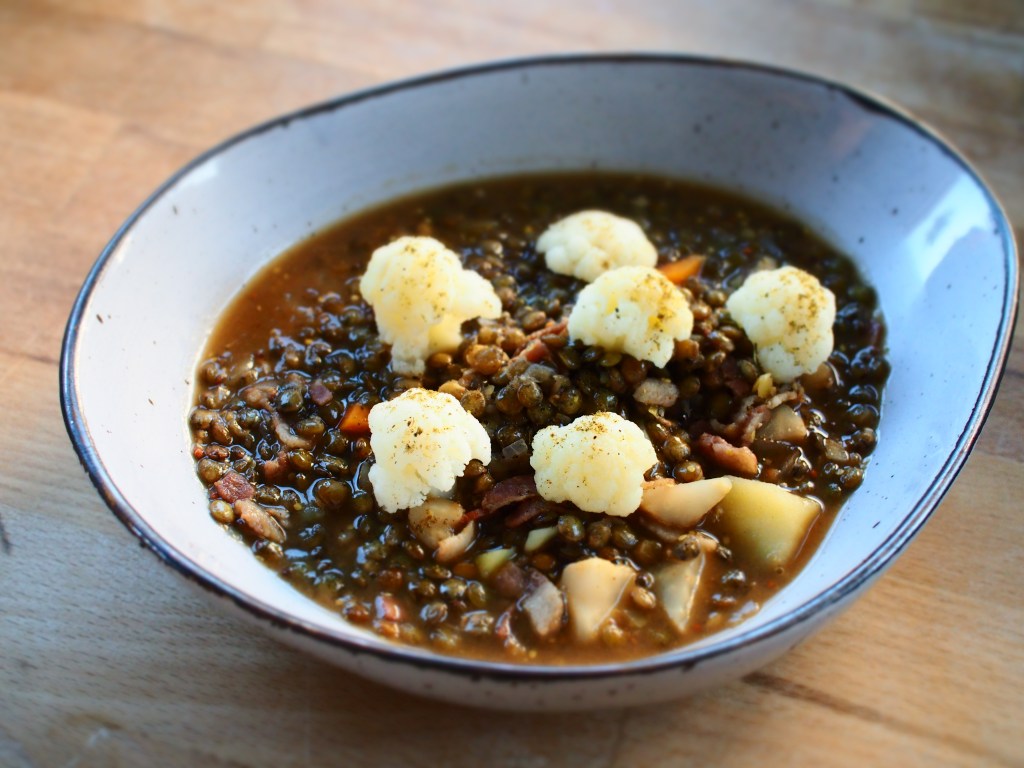 Wenn die Tage langsam wieder kürzer werden, steigt die Vorfreude auf wärmende Gerichte. Daher zeige ich euch eine tolle Art, wie ihr Linsen zubereiten könnt. Dafür braucht ihr zwar etwas Zeit, das Endergebnis lohnt sich aber – versprochen! Das Linsengemüse steht und fällt mit der Qualität der Brühe, die ihr zum Garen der Linsen hernehmt. Aus diesem Grund: mach die Brühe selbst, dann weißt du was drin ist. Kein Fertigprodukt hat die geschmackliche Tiefe, wie wenn sie selbstgemacht ist. Die Brühe ist also unsere Basis, sozusagen das Geschmacksfundament, dazu gesellen sich Speck, Butter, Kräuter, Senf und reifer Balsamico. On top ein paar Blumenkohlröschen, da diese gerade Saison haben. Abgerundet wird das Gericht mit einem Gewürz von Ankerkraut, das neu im Sortiment ist: „Pageou“ von Ali Güngörmüs. Benannt nach seinem gleichnamigen Restaurant beinhaltet es unter anderem Kreuzkümmel, Koriandersaat, Kardamom, Zimt und Bockshornklee und sorgt so für eine orientalisch-würzige Nuance. Und hier das Rezept: