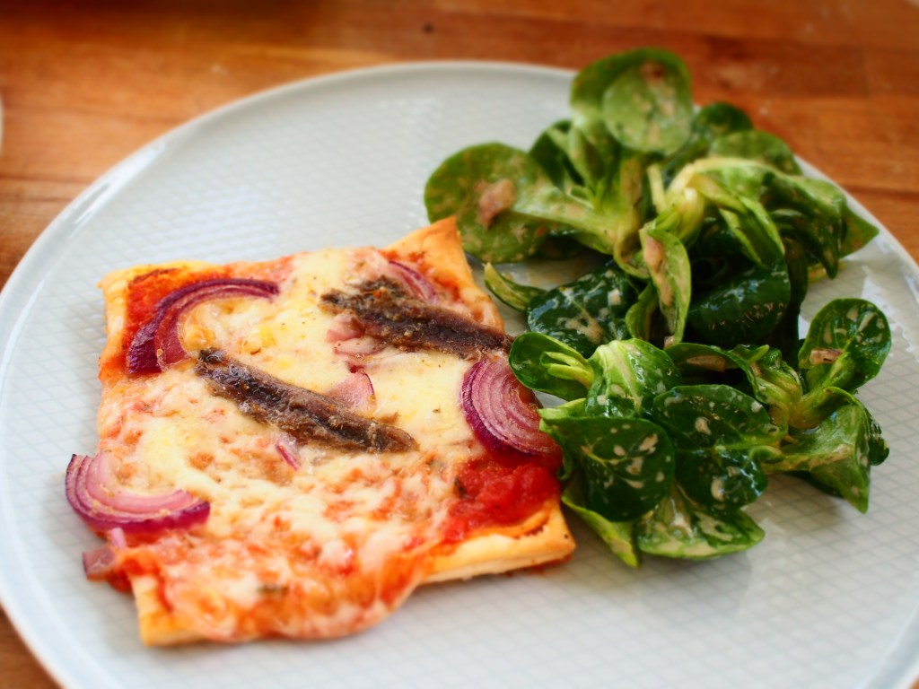Für die Pizza die Blätterteigplatten aus dem Tiefkühler nehmen und einzeln für 15 Minuten auf einem Blech mit Backpapier antauen. Zwiebeln in Ringe schneiden. Mozzarella in Stücke/Scheiben. In einem kleinen Topf etwas Olivenöl erhitzen und den Knoblauch dazupressen. Kurz anschwitzen und dann die Tomaten zugeben. Erhitzen und mit etwas Olivenöl und Salz abschmecken. Die Teigplatten mit Soße bestreichen und mit Mozzarella, Zwiebelringen und Sardellen belegen. Mit Olivenöl beträufeln und getrocknetem Oregano bestreuen. Für ca. 10 Minuten bei 200 Grad Ober/Unterhitze garen. Vor dem Anrichten den Salat anmachen.