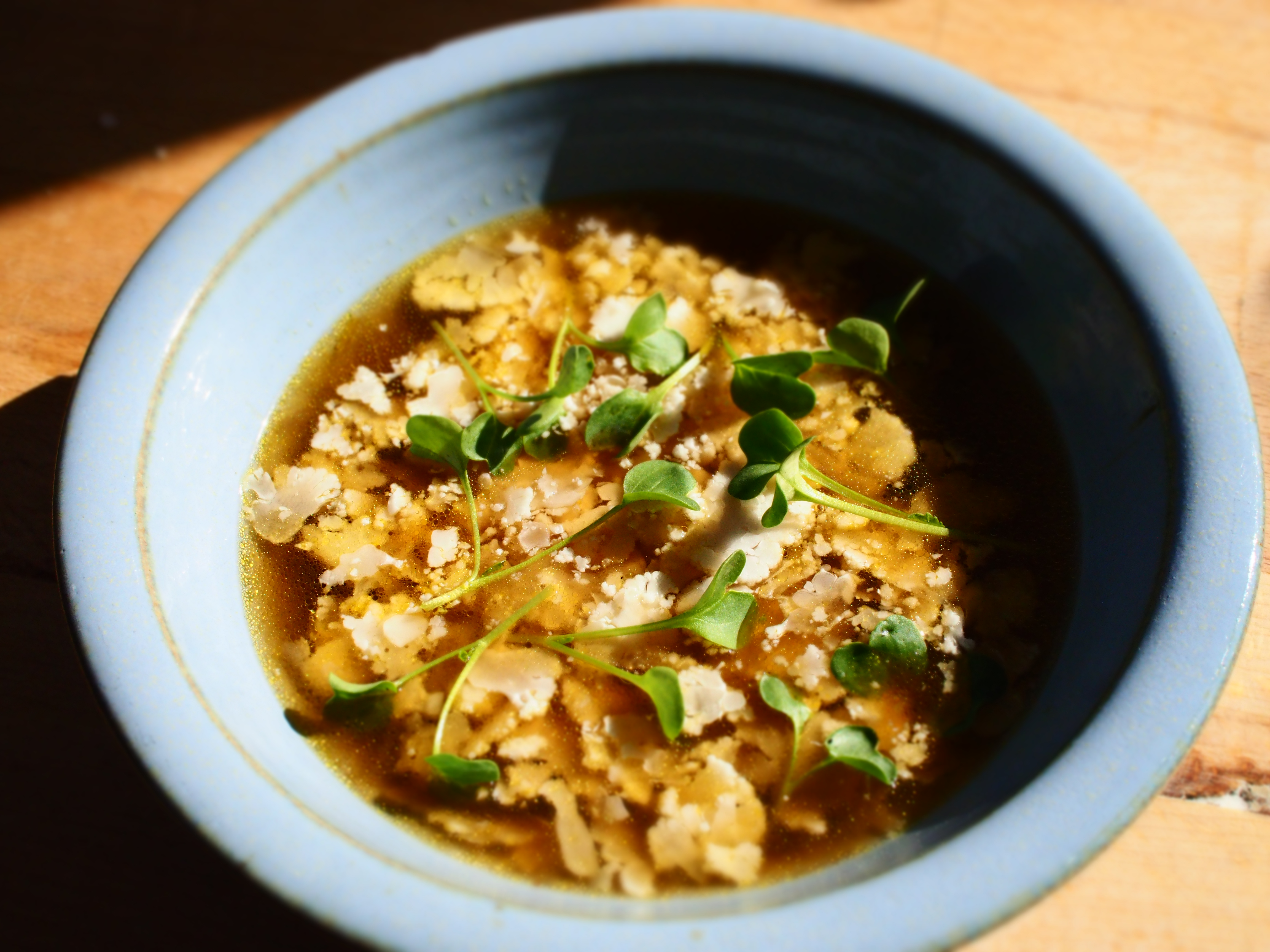 Heute gibts fein gehobelten Blumenkohl, der in einen Gemüsefond kommt, der vor Umami strotzt. Den Gemüsefond mache ich gerne auf Vorrat und friere ihn ein, da er eine tolle Grundlage für jegliche Linsengerichte, Risottos, Bratensoßen oder Suppen bietet. Hier kommt er puristisch mit rohem knackigen Blumenkohl zum Einsatz. Für die feine Schärfe sorgen Daikonrettich-Sprossen – auf der Fensterbank gezogen, versteht sich. Den Gemüsefond habe ich übrigens in Abwandlung aus dem grandiosen Buch „Aromen“ von H. Antoniewicz (meine Besprechung dazu findet ihr hier). Das Raffinierte an dem Fond: Knollensellerie wird geschält und diese Schalen werden im Ofen bei 250 Grad geröstet. Im Buch werden frische Champignons verwendet, ich verwende lieber getrocknete Pilze wie Totentrompeten – ein tieferer Pilzgeschmack! Und hier das hübsche Ergebnis: