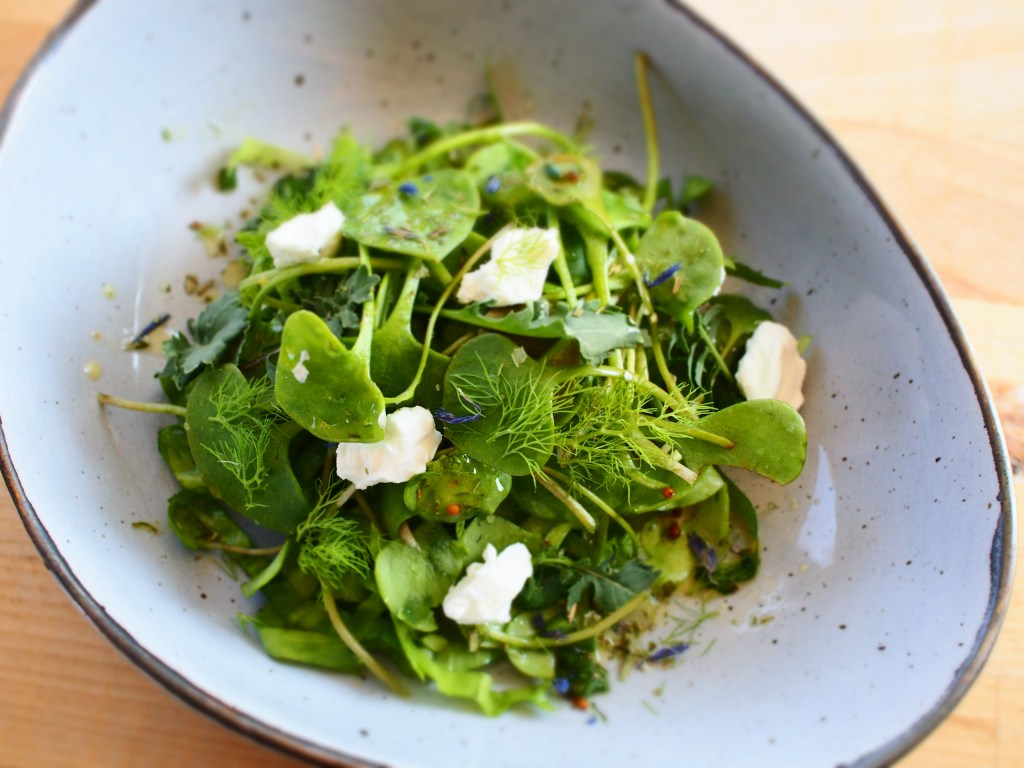 Portulak waschen und kurz in der Salatschleuder trocken schleudern. Vom Endiviensalat einzelne Blätter abzupfen und waschen. Mehrere Blätter aufeinanderlegen und etwas zusammenrollen, dann mit einem scharfen Messer in feine Streifen schneiden. Zum Abtropfen in ein Sieb geben. Für das Dressing Senf und weißen Balsamico mit den Ölen mischen (das Verhältnis entscheidet ihr – der eine mag es saurer, der eine milder). Salz und Zucker einrühren. Schnittlauch fein schneiden und dazugeben. Endiviensalatstreifen als Häufchen in Salatschälchen geben, darauf den Portulak verteilen. Großzügig mit dem Dressing beträufeln. Zügig mit Fenchelgrün, Wildkräutern, Rucola und Ziegenfrischkäse garnieren und sofort servieren – sonst fällt der Salat zusammen und verliert seine Knackigkeit.