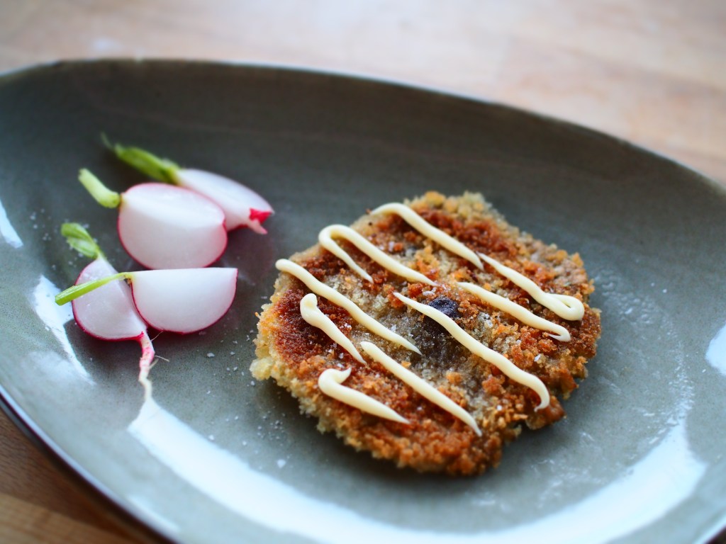 Radieschen waschen und vierteln. Etwas salzen und beiseite stellen. Für die Schnitzel die Schirme von vier Parasolpilzen hernehmen, die Stiele entsorgen – sie schmecken zäh und holzig. Ein Vollei in einem tiefen Teller verquirlen und mit Salz und Pfeffer würzen (und evtl. Pilzpfannengewürz einrühren). In einen weiteren tiefen Teller das Panko (oder Semmelbrösel) geben. Die Pilze rundum mit etwas Mehl bestäuben und leicht abklopfen. Im gewürzten Ei wenden und dann mit dem Panko panieren. Butter in einer Pfanne aufschäumen und die Schnitzel goldgelb, knusprig ausbraten. Sofort mit den Radieschen anrichten und mit Mayonnaise beträufeln.