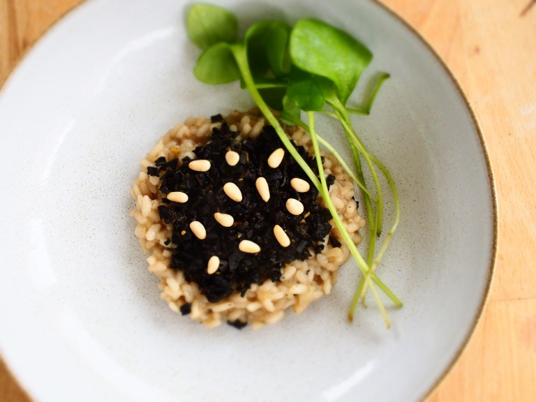 Risotto mit Totentrompeten, Zedernüssen und Portulak