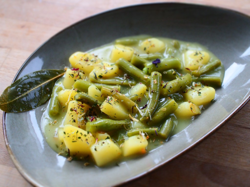 Ein Klassiker der einfachen, schwäbischen Küche: Saure Bohna mit Kardoffla. Dieses Gericht weckt bei mir Kindheitserinnerungen. In dem tollen Kochbuch von Simon Tress „Echt schwäbisch!“ ist das Rezept in ähnlicher Form zu finden – und viele weitere Klassiker ausm Ländle: Flädlesupp, Zwiebelroschdbroda, Spätzla, Grießschnitta und und und … Vor allem ohne Schnickschnack. Wer die schwäbische gehobene Küche sucht, der schaut sich lieber bei Heimat Weite Welt um. Ein Buch, das schwäbische Sterneküche und bodenständige Rezepte vereint, bietet natürlich schwäbisch. Zum Rezept: mir gefällt der würzig-säuerliche Geschmack der sämigen Sauce, der durch Essig zustande kommt, für die Würze sorgen frisches Bohnenkraut und Thymian, der Knoblauch, den man erst am Ende zugibt, ist auch gut zu schmecken! Getoppt habe ich das Gericht mit verschiedenen getrockneten Kräutern („Almwiese“ von Vitus Winkler) – sieht schön aus und würzt durch das darin enthaltene Steinsalz nochmals leicht nach.