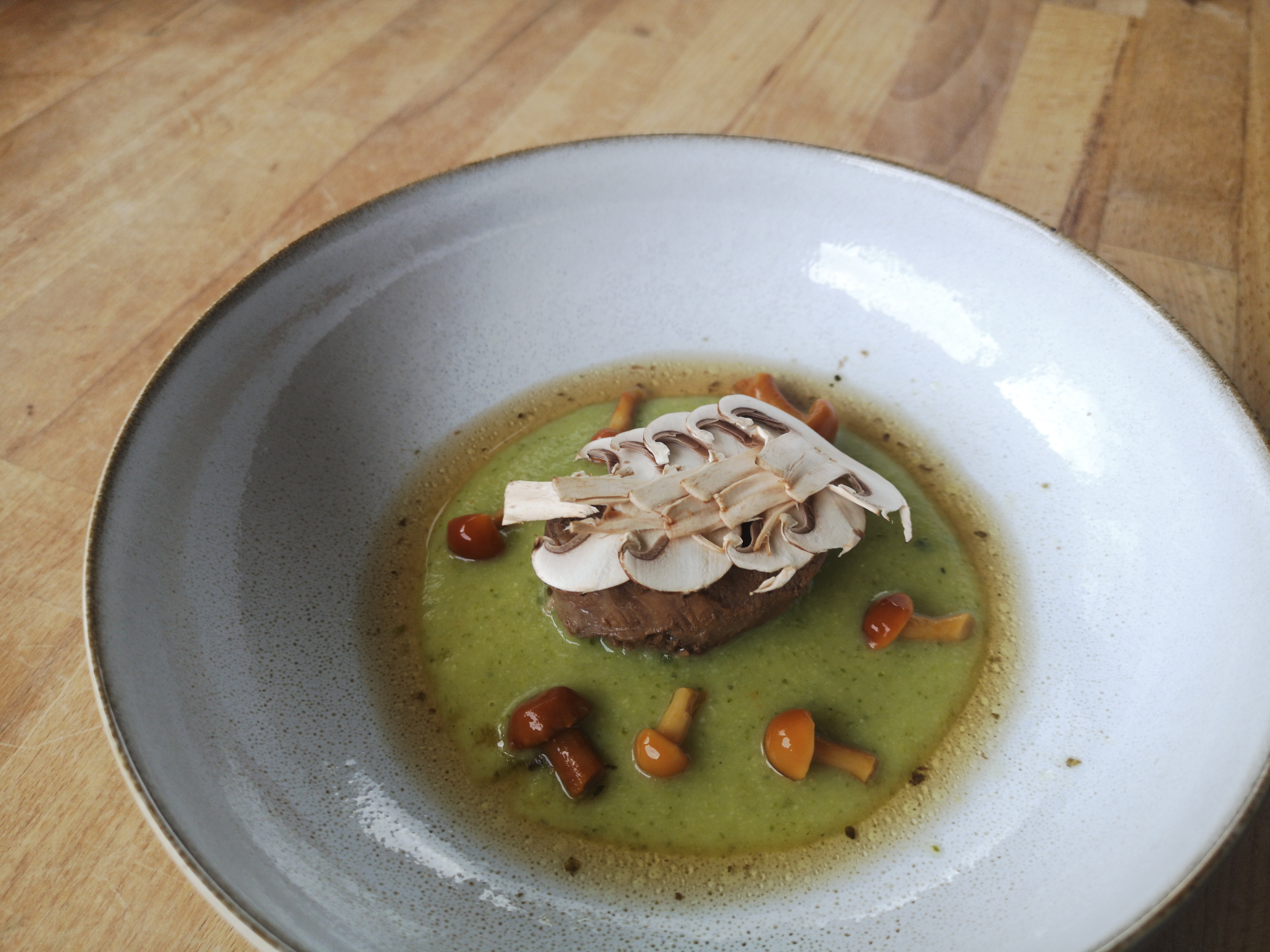 Zum Anrichten jeweils mittig etwas Püree auf tiefe Teller geben, ein bis zwei Bäckchen auflegen, darauf gehobelte Champignons setzen. Schmorsud außen angießen und ein paar Stockschwämmchen anlegen.