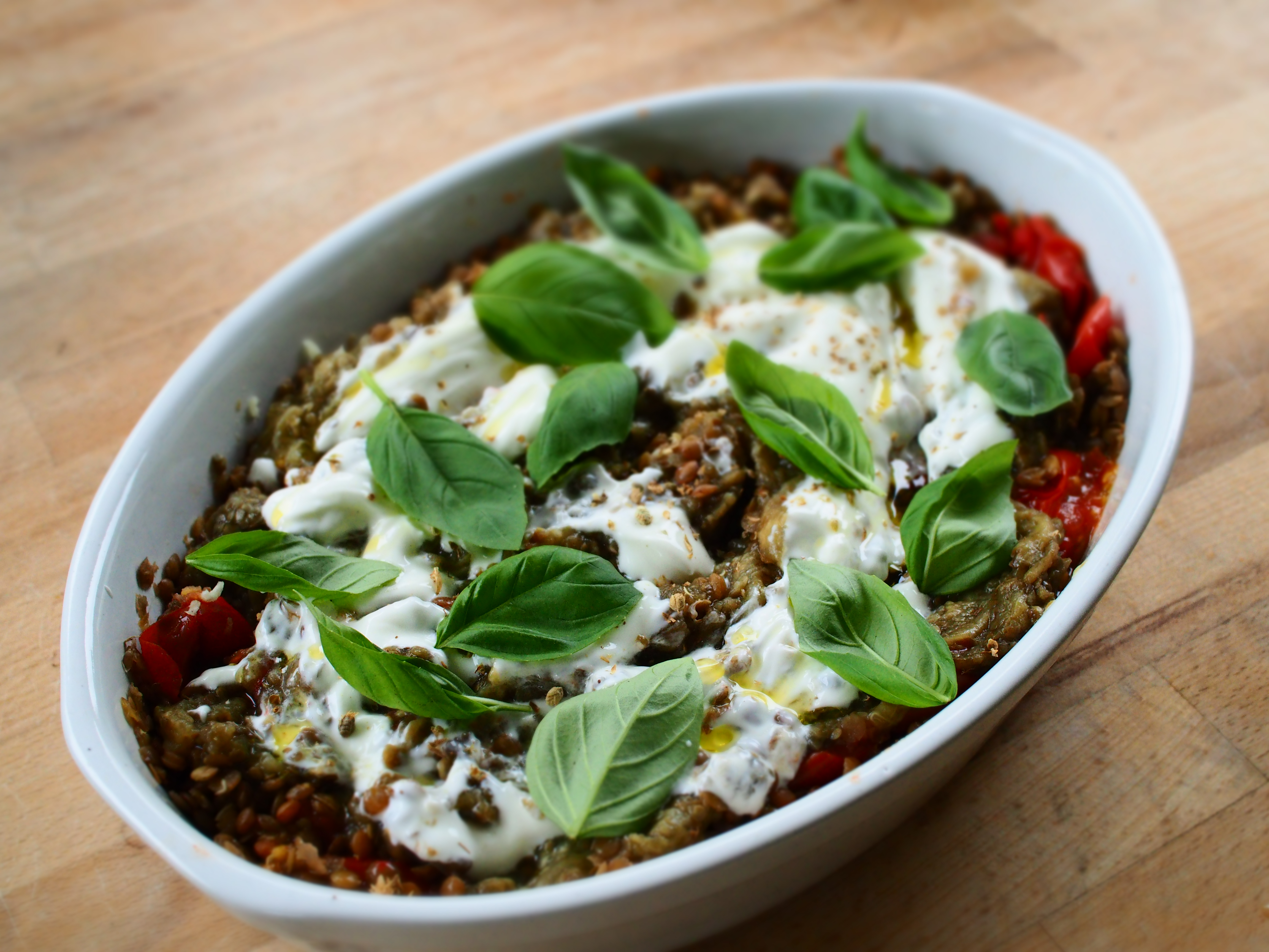 Für die Linsen ein Topf mit reichlich Wasser zum Kochen bringen. Linsen hineingeben und je nach Linsensorte bei mittlerer Hitze ca. 20 Minuten garen, bis sie „al dente“ sind. Linsen abgießen und in eine große Form geben. Mit dem Auberginenfleisch, den Tomaten, Olivenöl, Zitronensaft, Knoblauch (gepresst), Oregano (oder Basilikum), Salz und Pfeffer vermengen. Kurz vor dem Servieren den Joghurt unterziehen und mit etwas Olivenöl, Basilikum und Salz abrunden.