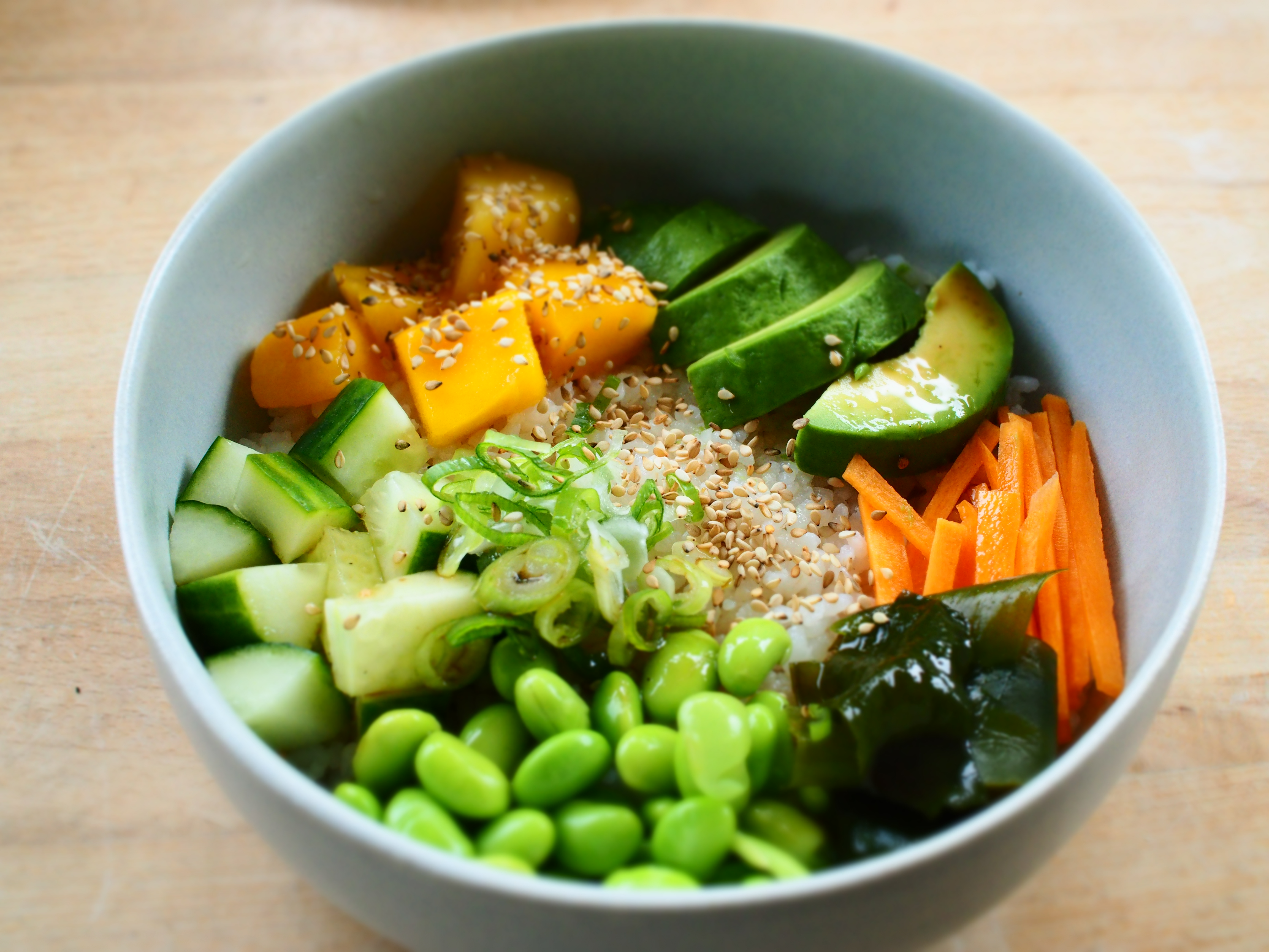 Für das Topping Edamame eventuell in 5 Minuten gar kochen (TK-Ware) und im kalten Wasser abschrecken. Mango, Gurke und Avocado in mundgerechte Würfel schneiden. Frühlingslauch in feine Ringe, Karotte in sehr feine Stiftchen. Wakamealgen, wenn sie getrocknet sind, in kaltem Wasser einweichen.