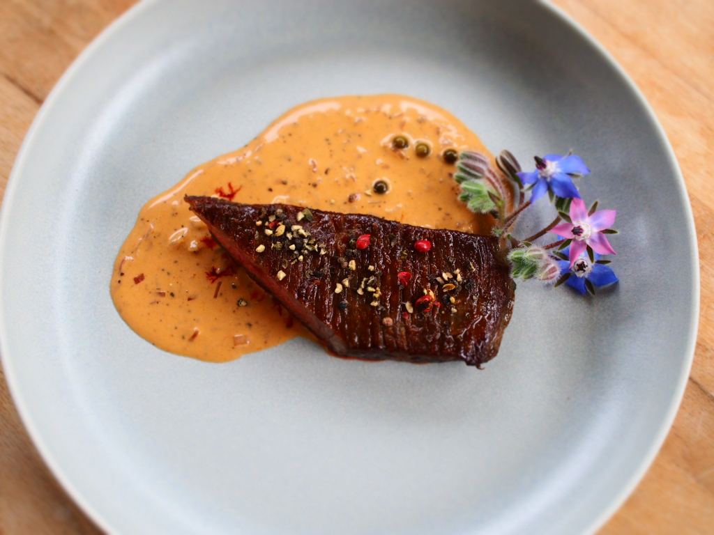 Wie der Titel schon sagt: mehr ist es nicht. Muss aber auch nicht. Denn allein das Sößchen ist ein Traum! Ich habe sie in einem Post von Nils Jorra gesehen und musste sie gleich ausprobieren. Als Beilage passt natürlich ein frischer Salat, Kartoffelgratin oder auch Pommes Frites. Als Steak habe ich Flank vom Wagyu genommen – das hat einen schönen kernigen Biss. Die Qualität ist des Fleisches ist dabei entscheidend. Ich kaufe am liebsten Fleisch vom Wagyu-Rind bei Benjamin Junck. Seine Wagyu- und Angus-Rinder leben von April bis November in Mutterkuhhaltung am Albtrauf im Killertal auf 700 m Höhe auf 300 ha extensiver Grünlandfläche. Im Winter sind die Tiere in Gruppen und großzügigen Stallungen auf Stroh im Vornagelhof untergebracht. Junck zerlegt das Fleisch selbst und vertreibt es über seinen Familienbetrieb vor Ort oder über seinen kürzlich eröffneten Onlineshop. Einige Zuchterfolge sprechen für die Qualität seiner Rinder. So wurde zuletzt der Wagyu-Zuchtbulle VG Tsuyoshi bei der 1. Bundesschau 2022 zum Gesamtsieger gekürt und erhielt noch im selben Jahr den Titel „Champion of the World“. Schaut euch mal paar Bilder vom Vornagelhof auf Instagram an und bestellt im Onlineshop. Oder schaut vor Ort vorbei und lasst euch den Hof und seine Rinder zeigen! Und nun aber zurück zum Rezept:
