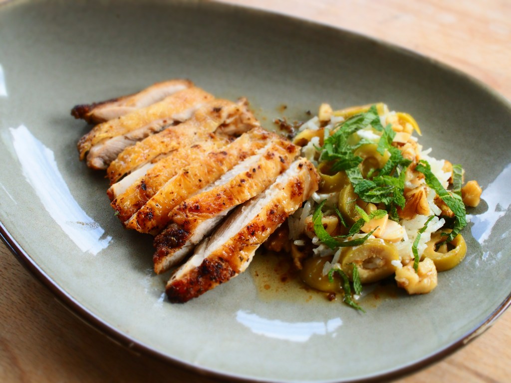 Ich hatte mal wieder Lust, ein Rezept von Ottolenghi auszuprobieren. Und da gerade die Minze in meinem Garten schön wächst, habe ich mich für den gebackenen Reis mit Minze und Oliven-Salsa entschieden. Der Clou: der Reis wird in einer Auflaufform mit frischen Minzstängeln im Ofen gegart und kurz vor dem Servieren mit frischer Minze, grünen Oliven, Walnusskernen und Feta bestreut – super Kombination! Laut Rezept gehören noch Granatapfelkerne rein und ein Schuss Granatapfelsirup. Schmeckt aber auch ohne. Das Rezept habe ich in Abwandlung aus Ottolenghis Simple, welches ich an dieser Stelle euch vorgestellt habe. Zum Reis passt knuspriges Hühnchen gut, hier habe ich Pollo Fino hergenommen. Es geht aber auch eine Hühner- oder Entenbrust, oder ihr macht dazu Köfte. Der Reis geht aber auch wunderbar solo, nur mit einem frischen Salat als Beilage. Probierts mal aus: