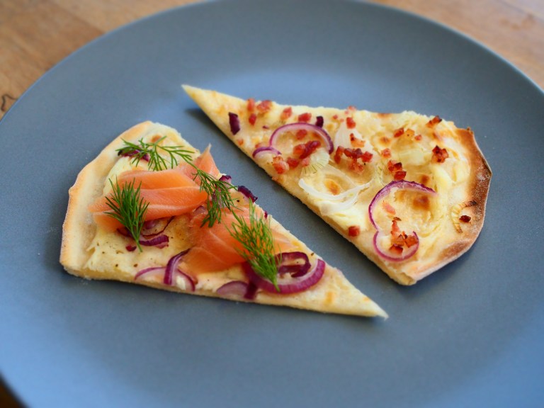 Ja, der Herbst naht. Auch wenn man es angesichts der aktuellen Temperaturen kaum glauben mag. Aber wer sagt eigentlich, dass Flammkuchen nicht auch im Sommer ein super Essen sind? Und ich finde selbst kalt schmecken sie, zum Beispiel als Beilage zum Grillen, fürs Picknick oder für den Ausflug. Ich habe als Belag für meinen Flammkuchen einmal ganz klassisch Speck und Zwiebeln verwendet und einmal Räucherlachs und Dill. Im Herbst oder Winter ist dann die Variante mit Kürbis, Rosmarin und Ziegenfrischkäse dran. Den Teig mache ich mittlerweile selbst, denn er gelingt immer. Also bitte mal ausprobieren und die überteuerten Fertigteige ausm Supermarkt liegen lassen. Achja, hier noch eine Übersicht über den Fettgehalt von Schmand, Crème fraîche und Co, falls sich jemand fragt, warum sich für Flammkuchen Schmand am besten eignet und warum er nicht ersetzt werden sollte. Allen gemeinsam ist die Bezeichnung „Sauerrahmprodukt“, das heißt die Grundlage ist Sahne (Rahm), die mithilfe von Milchsäurebakterien sauer gemacht wird (fermentiert):