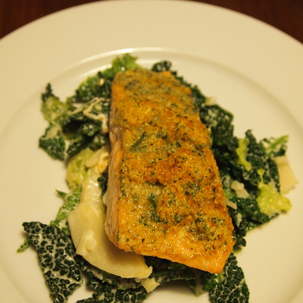 Lachsfilet in der Senfkruste mit Meerrettich-Birnen-Wirsing