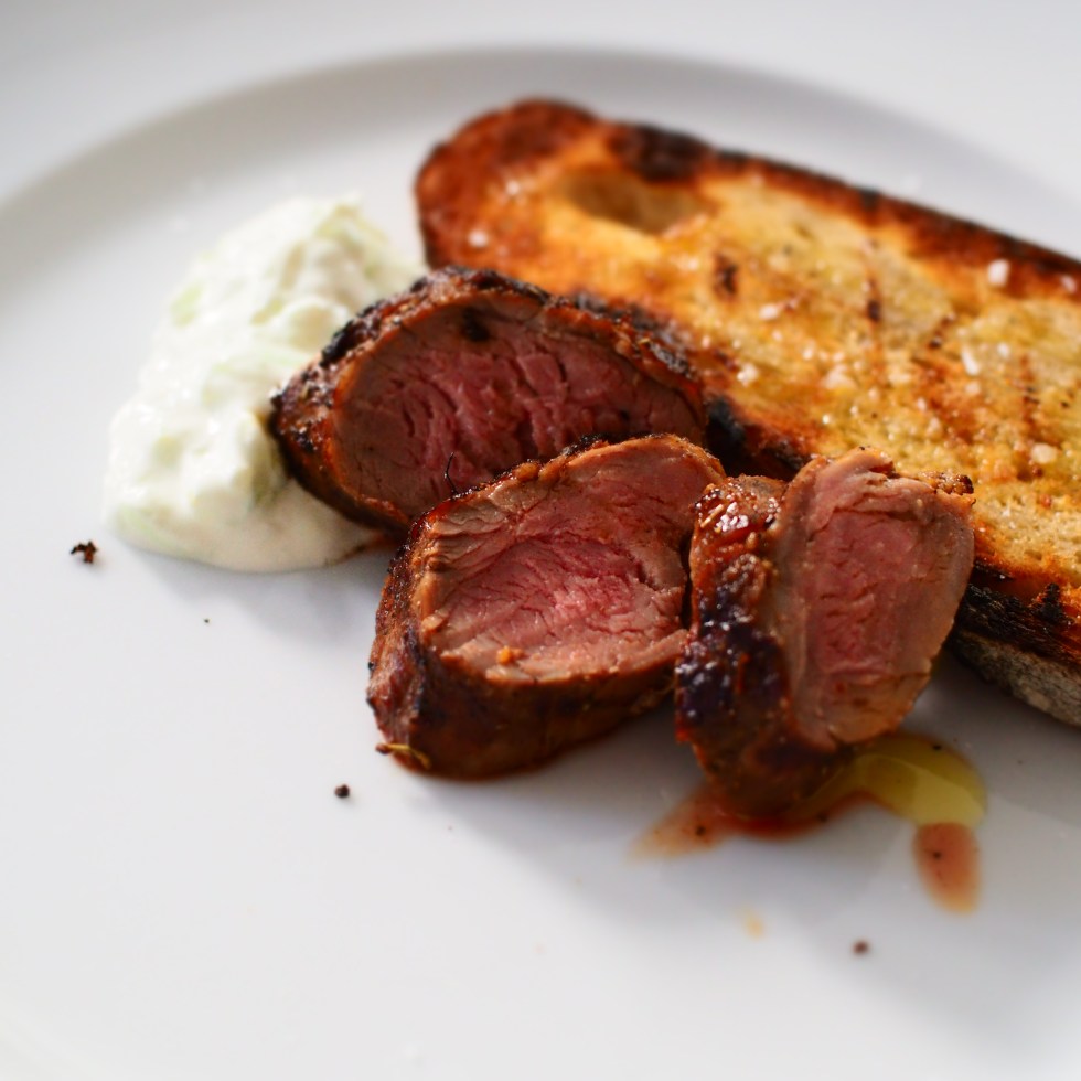 Ibérico Solomillo Bellota vom Grill, Tzatziki und Röstbrot