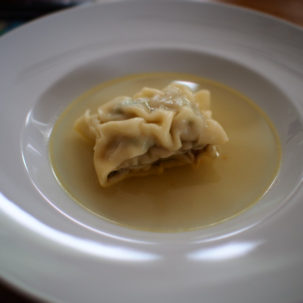 Gerollte Maultaschen in heller Buttergemüsesuppe